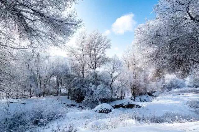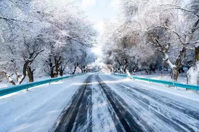 林荫大道一片雪白,树上结满了冰挂,雾凇,配上蓝天白云,一幅绝美的画卷就这样一次次地冲击着我们的视野。于是我们急忙让司机停车,给我们预留10分钟的时间拍照,在新疆的几天没少见过雪景,但凭心来说,这是我目前见过的最美的雪景了,突然有点感恩昨夜的那场大雪,让世界变得“童话”起来。说好的10分钟被我们硬生生拖到了25分钟,尽管司机师傅已在催促,还是没能收住我们欣喜若狂的内心。