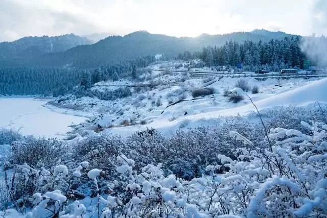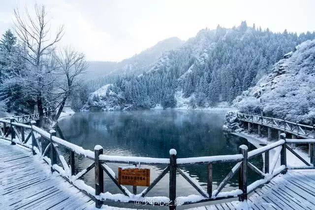 西小天池是行程的第一个点,来到池边时,天空正飘着小雪,湖水倒映着岸边的树木,到处银装素裹,宛如水墨画,美不胜收。