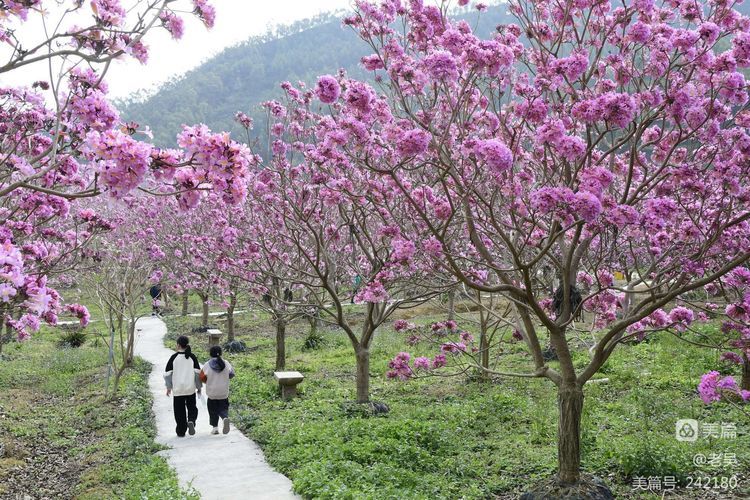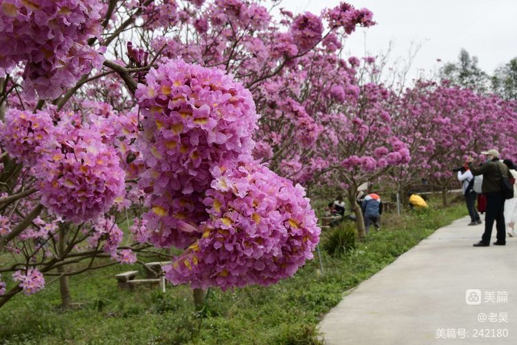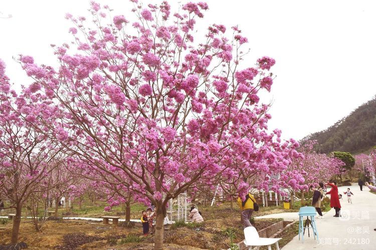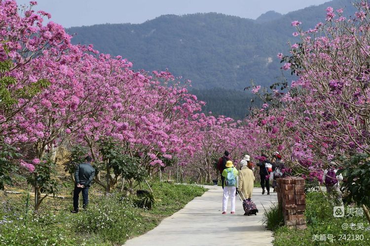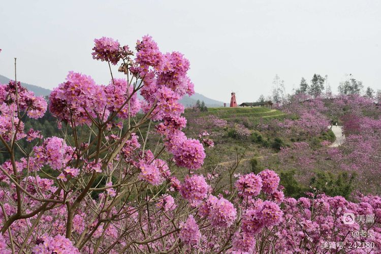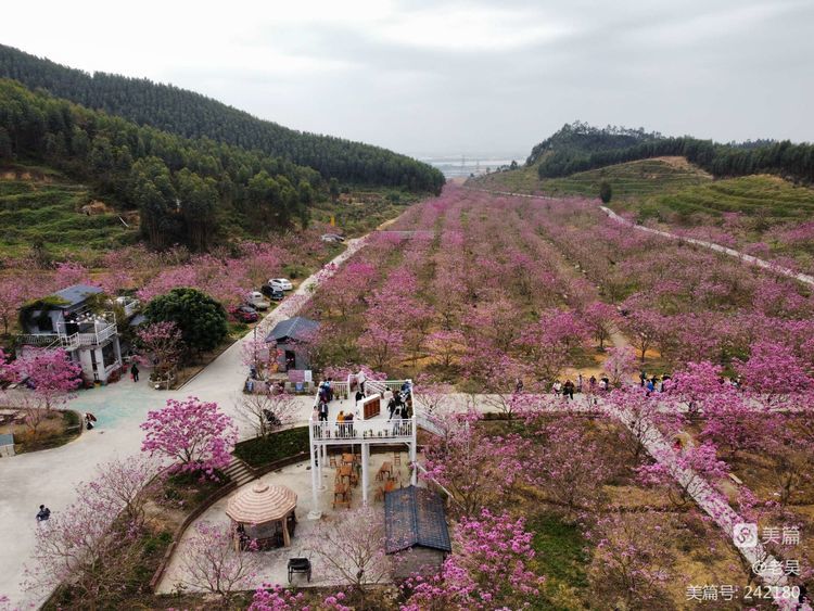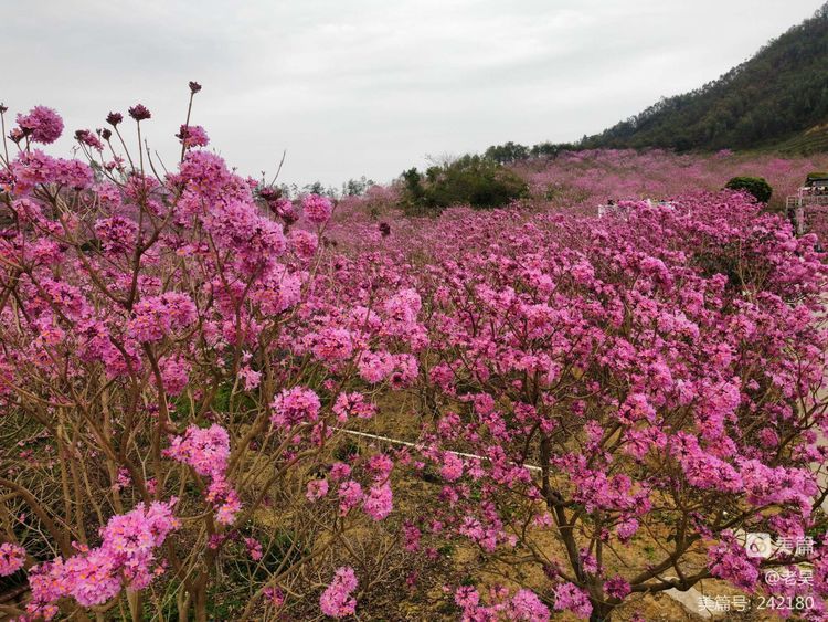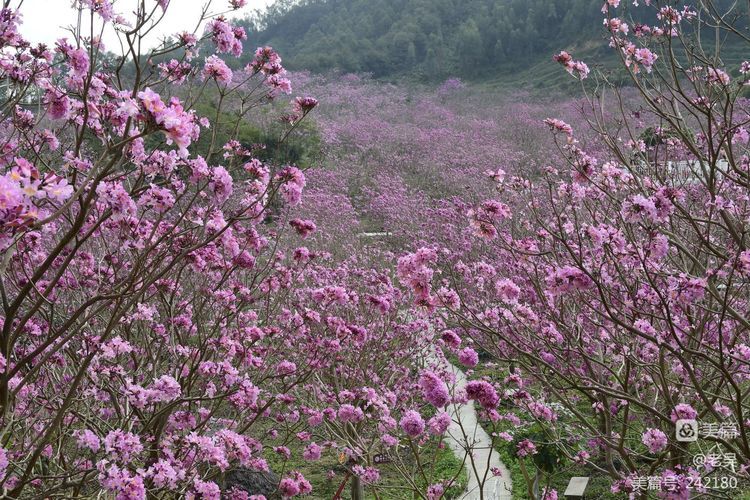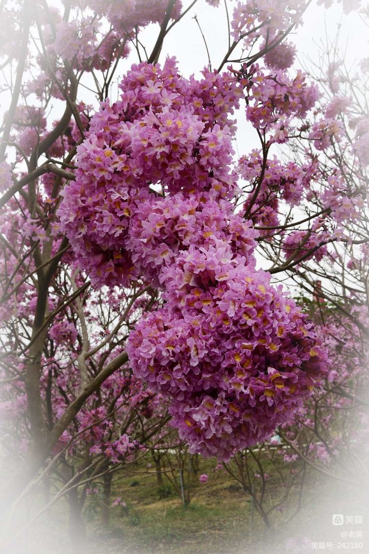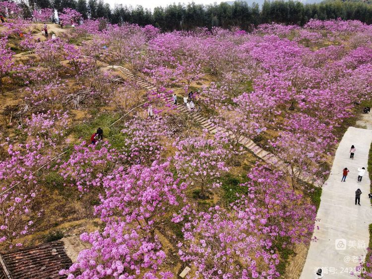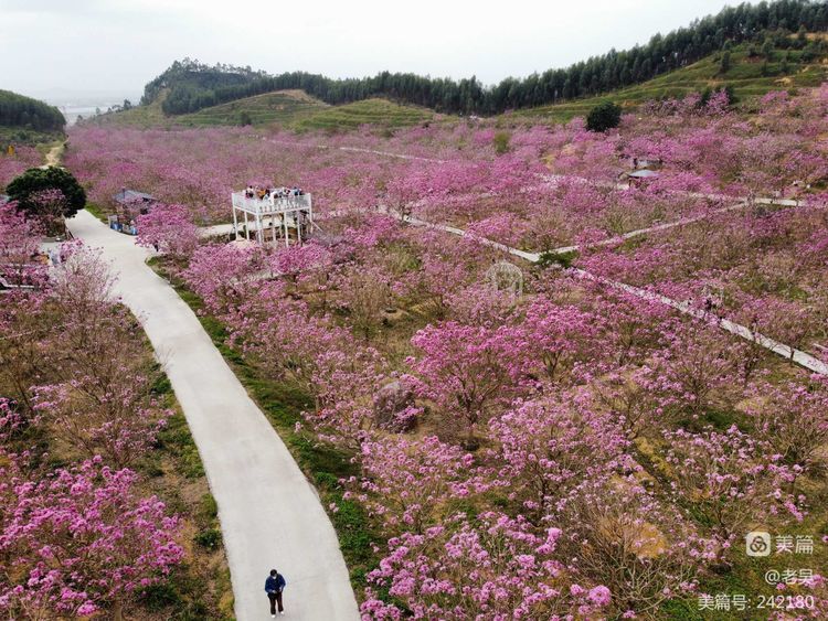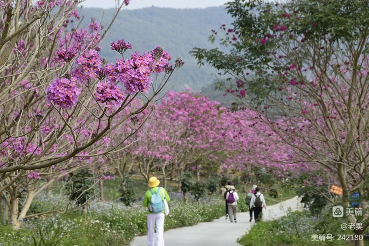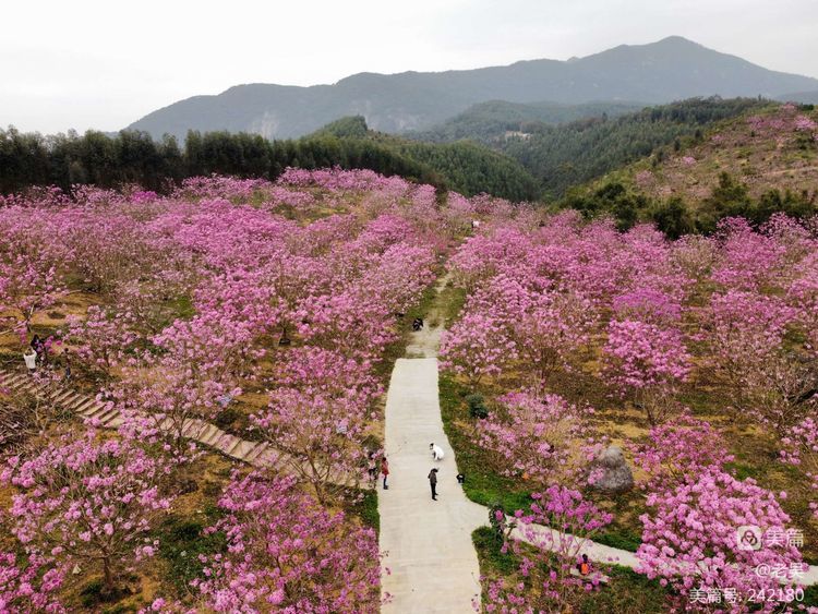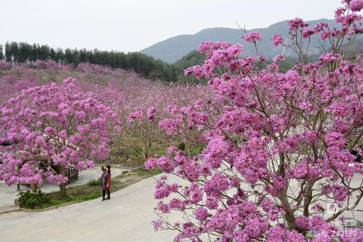 江门市新会区大泽镇的绿美生态农场,是紫花风铃木树苗的种植基地,近几年成了网红打卡点,一月下旬到二月初,农场山谷里一片片紫花风铃花盛开,一簇簇粉紫色的风铃花缀满枝头,空气中弥漫着淡淡的素雅清香,近看是一个个圆圆的花球,远看是一片片粉紫色的花海,蔚为壮观也。