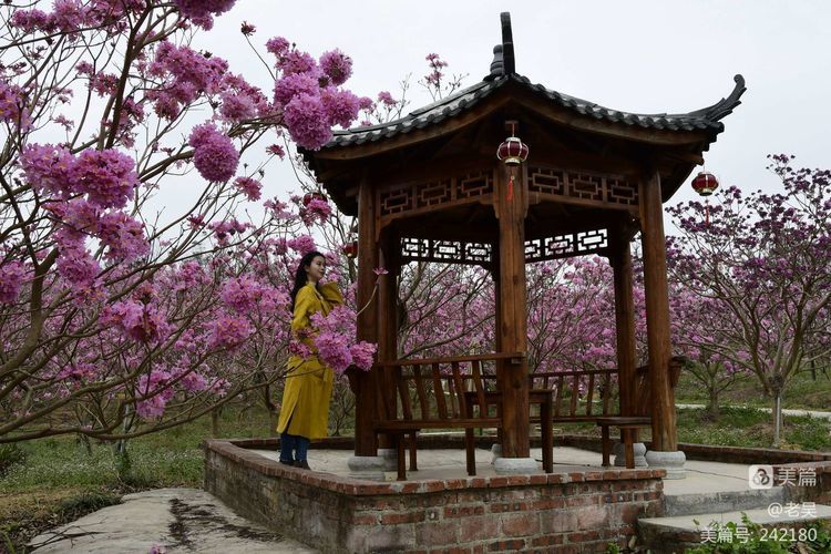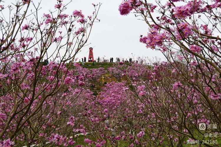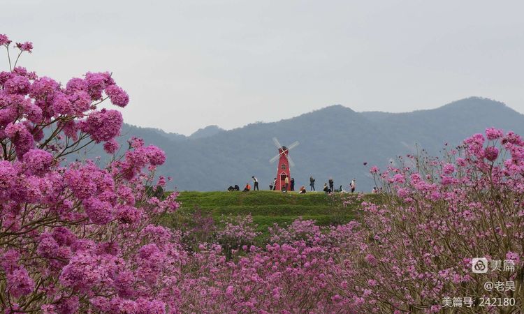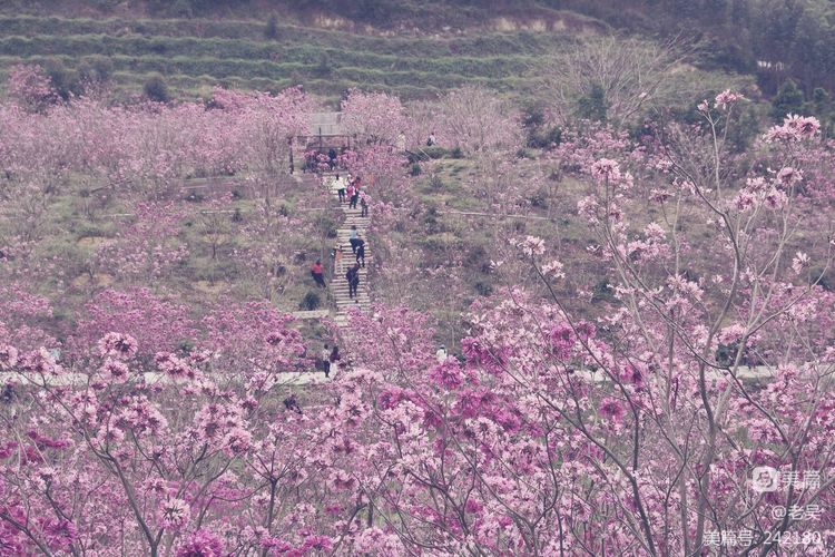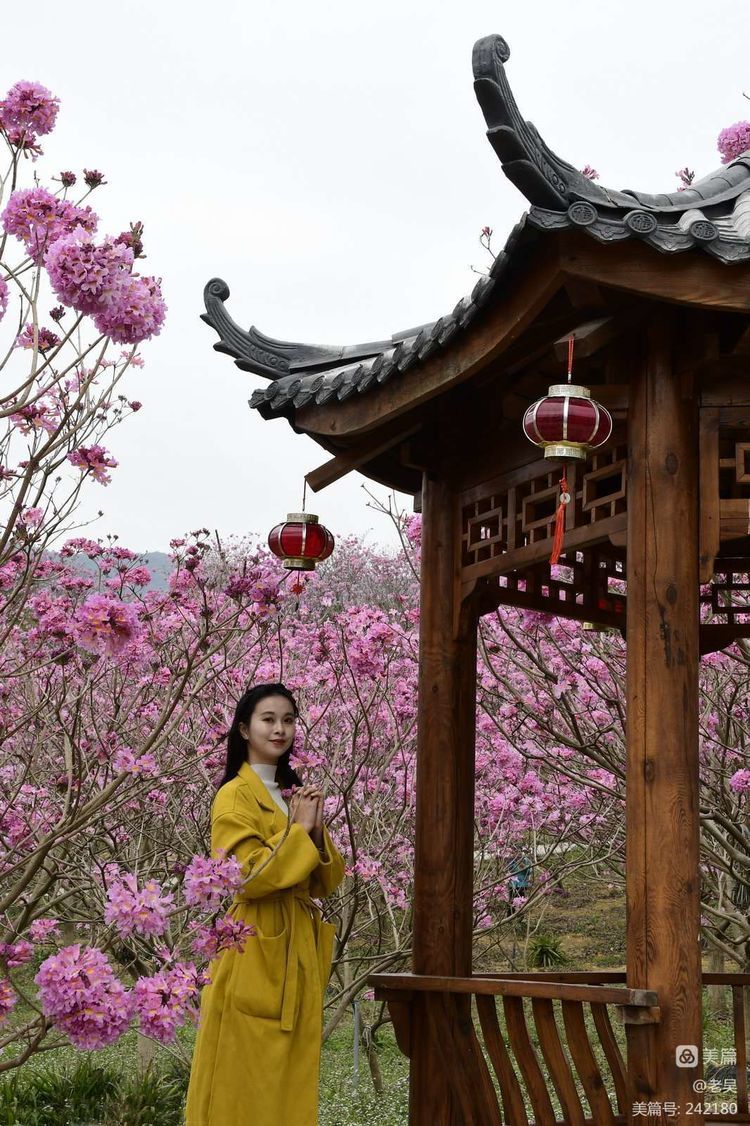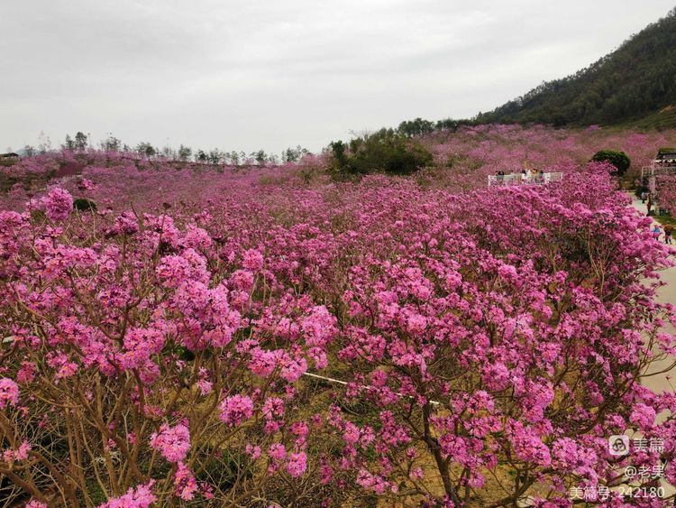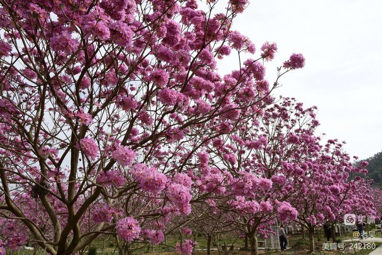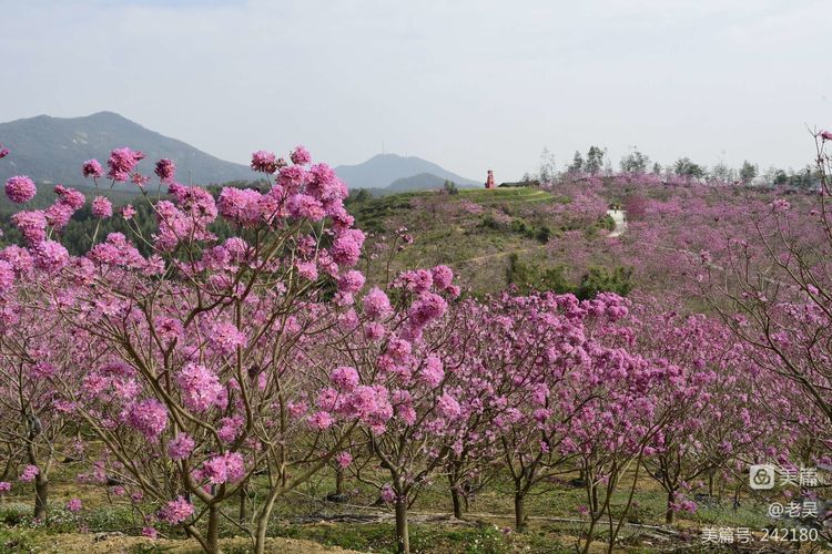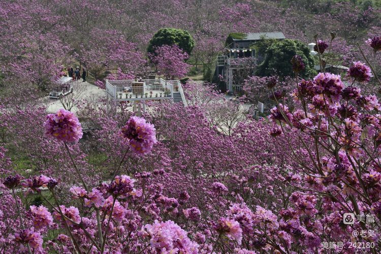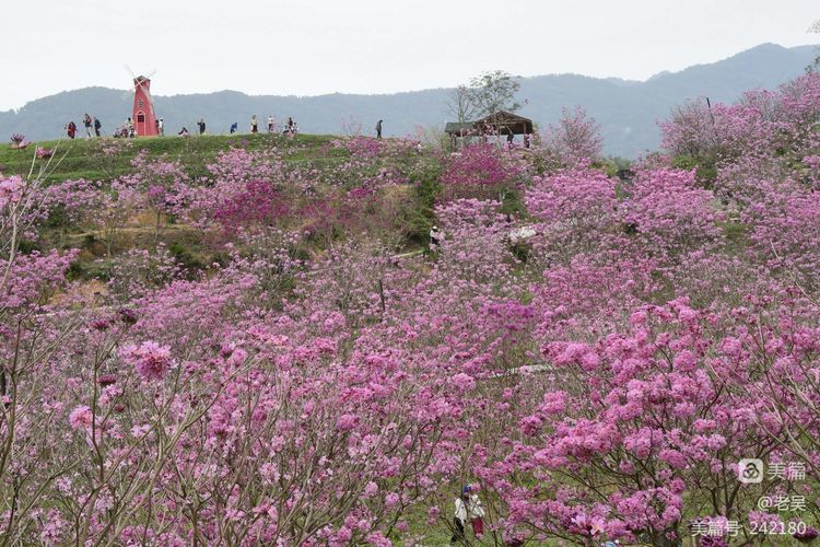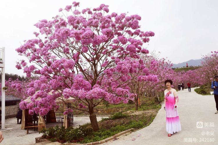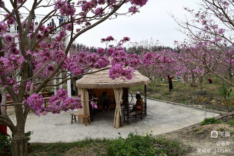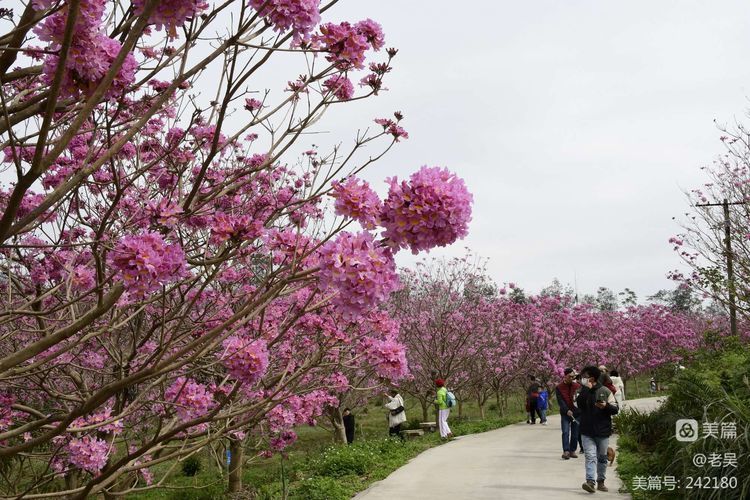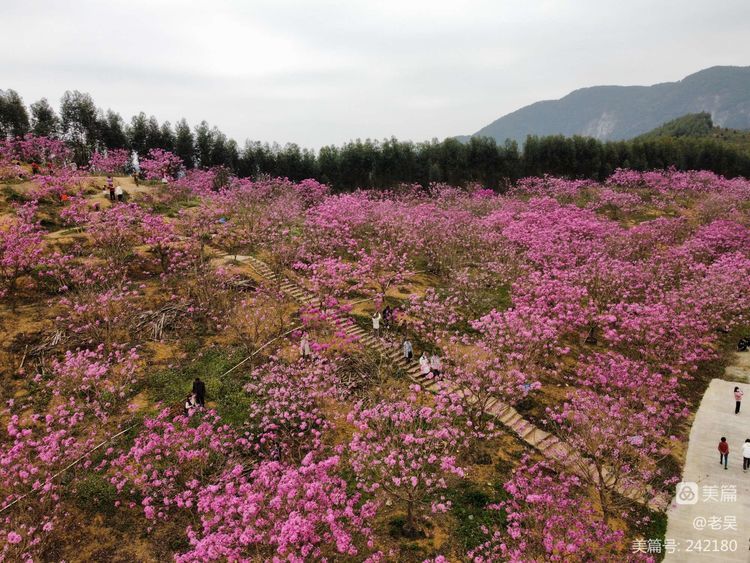江门市新会区大泽镇的绿美生态农场,是紫花风铃木树苗的种植基地,近几年成了网红打卡点,一月下旬到二月初,农场山谷里一片片紫花风铃花盛开,一簇簇粉紫色的风铃花缀满枝头,空气中弥漫着淡淡的素雅清香,近看是一个个圆圆的花球,远看是一片片粉紫色的花海,蔚为壮观也。