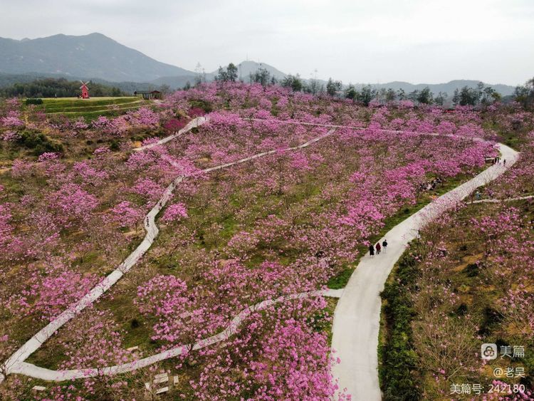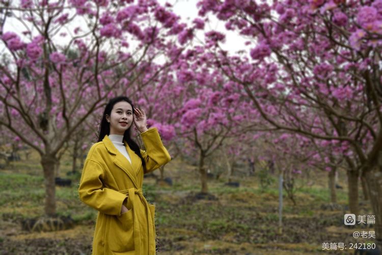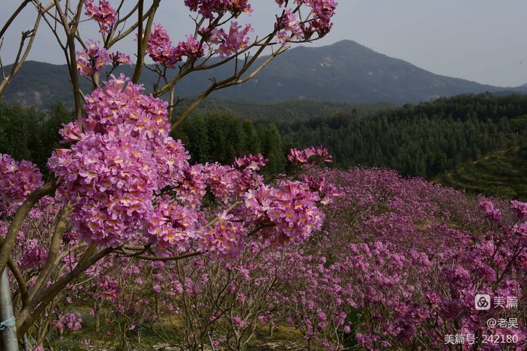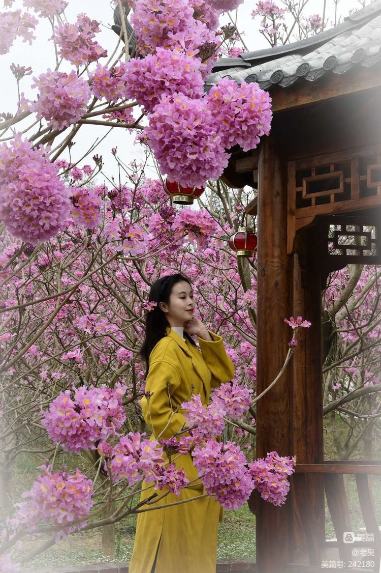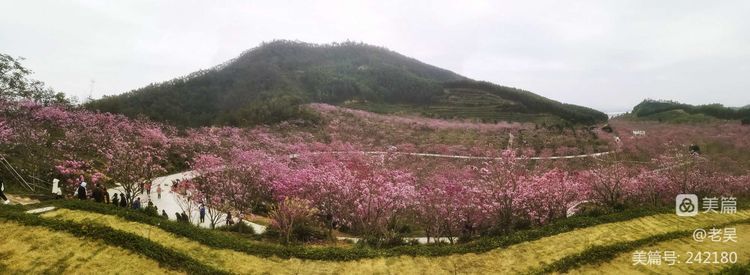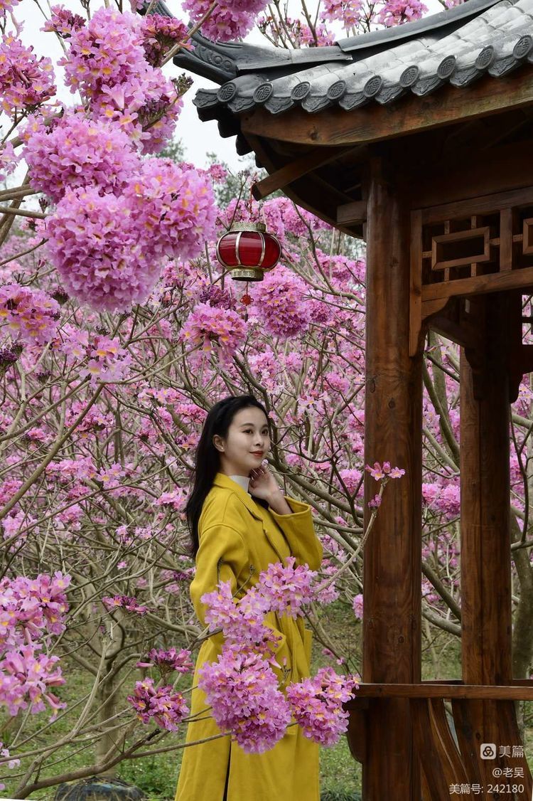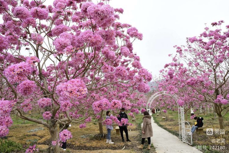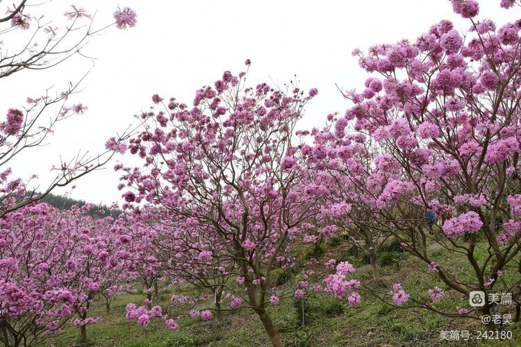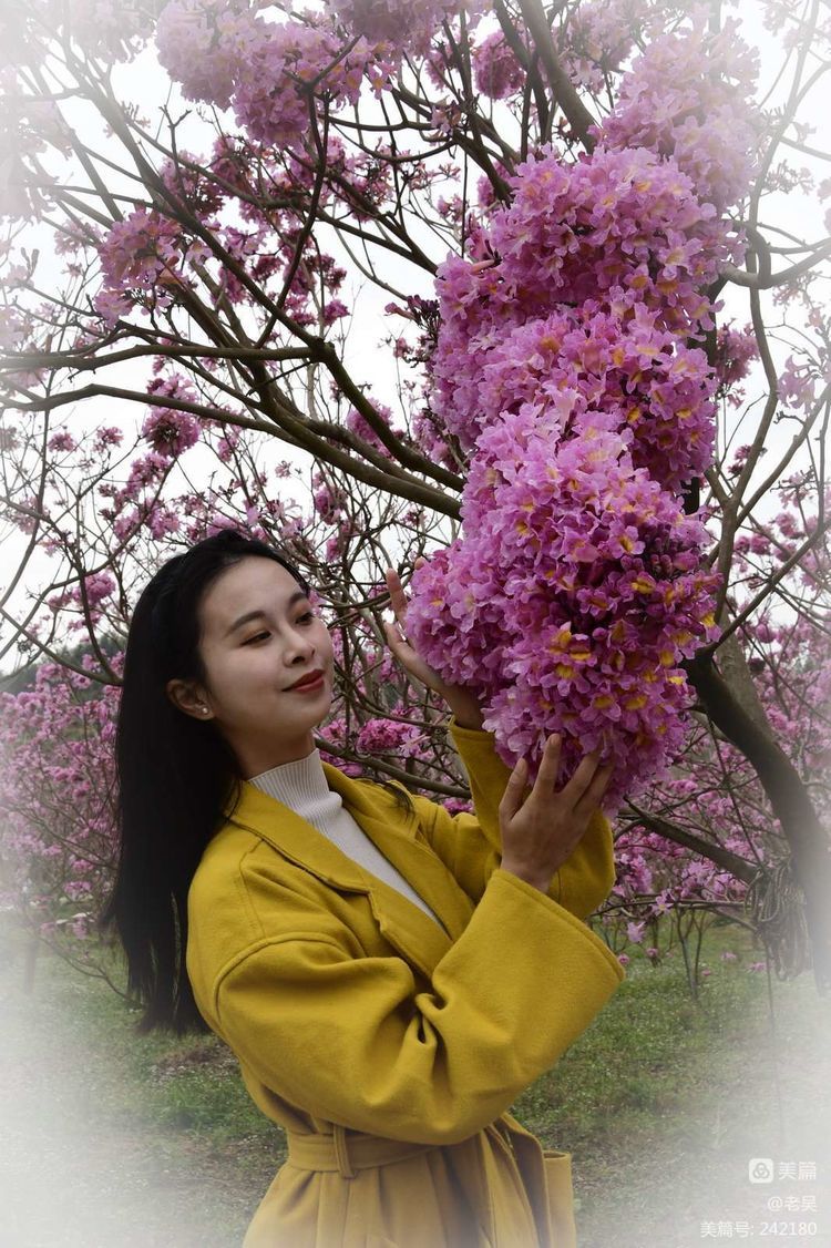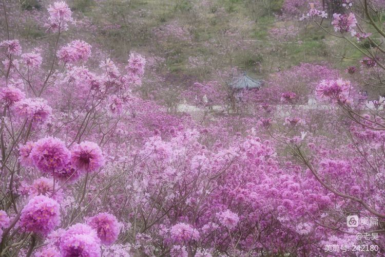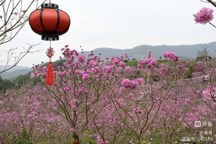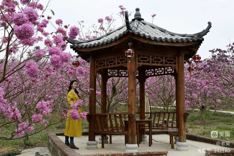 江门市新会区大泽镇的绿美生态农场,是紫花风铃木树苗的种植基地,近几年成了网红打卡点,一月下旬到二月初,农场山谷里一片片紫花风铃花盛开,一簇簇粉紫色的风铃花缀满枝头,空气中弥漫着淡淡的素雅清香,近看是一个个圆圆的花球,远看是一片片粉紫色的花海,蔚为壮观也。