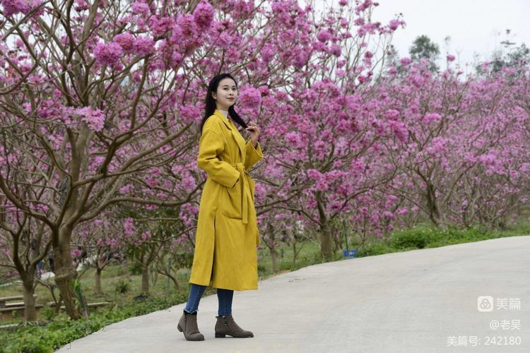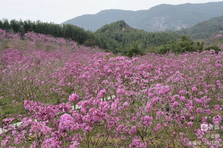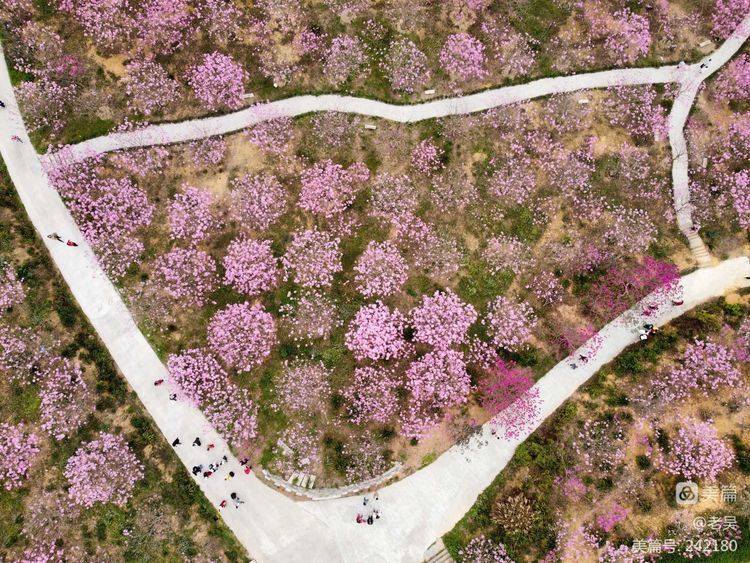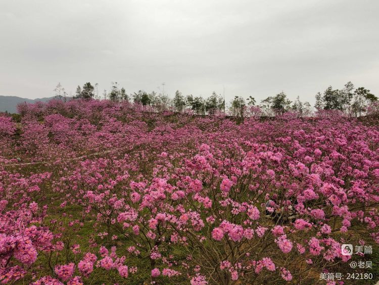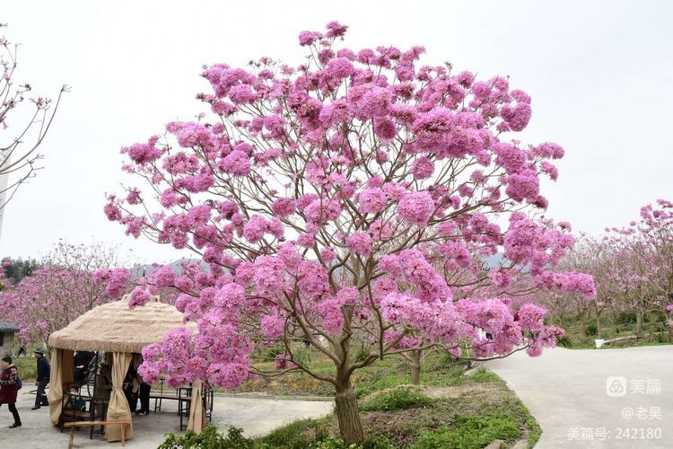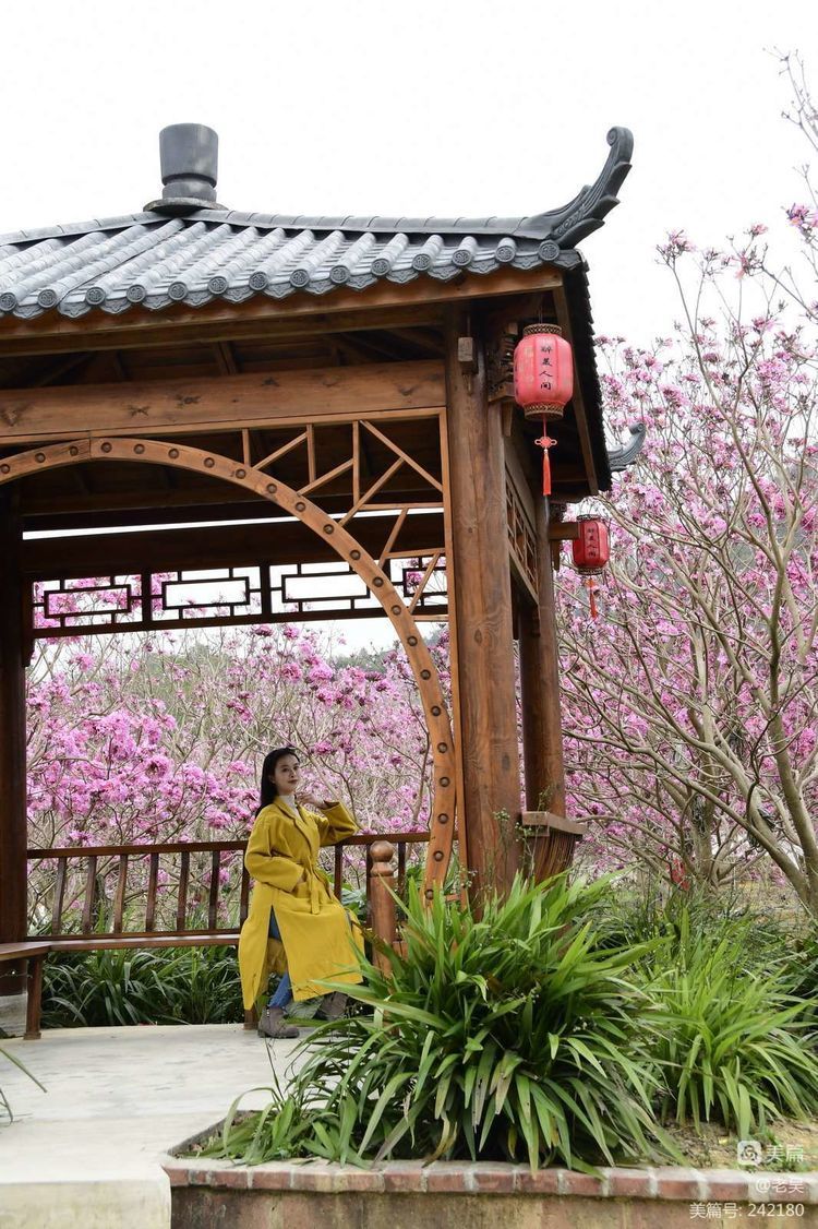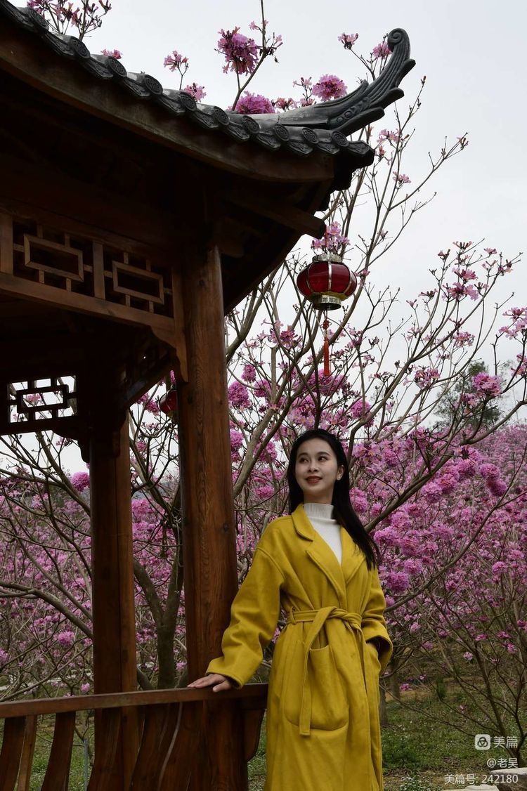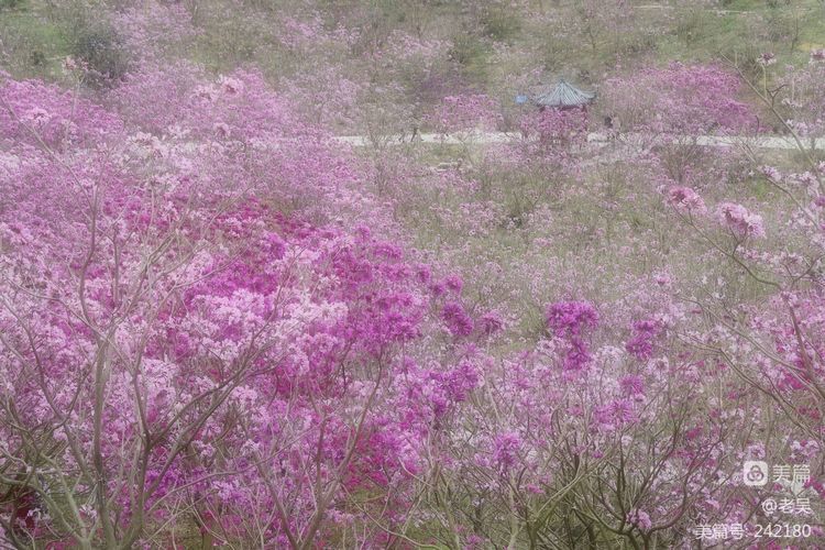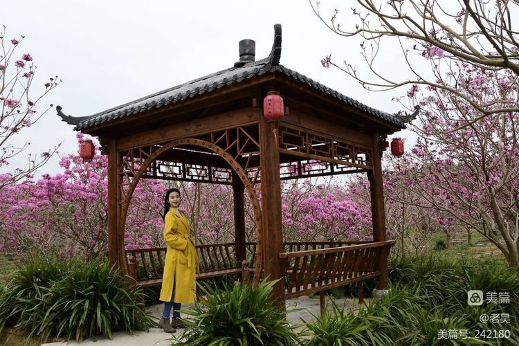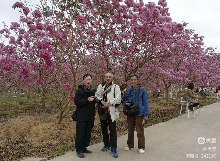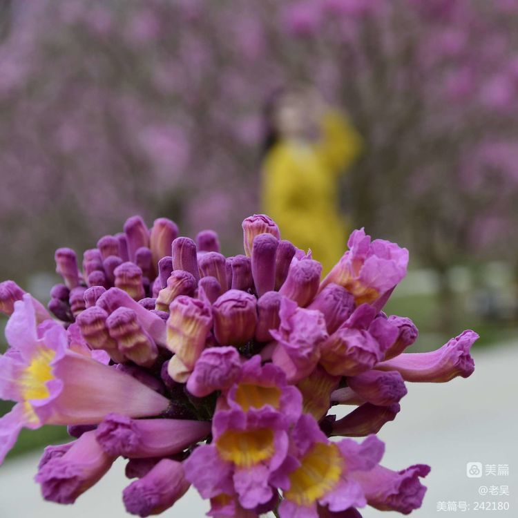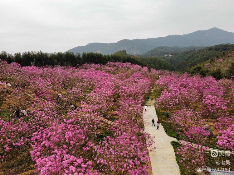 江门市新会区大泽镇的绿美生态农场,是紫花风铃木树苗的种植基地,近几年成了网红打卡点,一月下旬到二月初,农场山谷里一片片紫花风铃花盛开,一簇簇粉紫色的风铃花缀满枝头,空气中弥漫着淡淡的素雅清香,近看是一个个圆圆的花球,远看是一片片粉紫色的花海,蔚为壮观也。