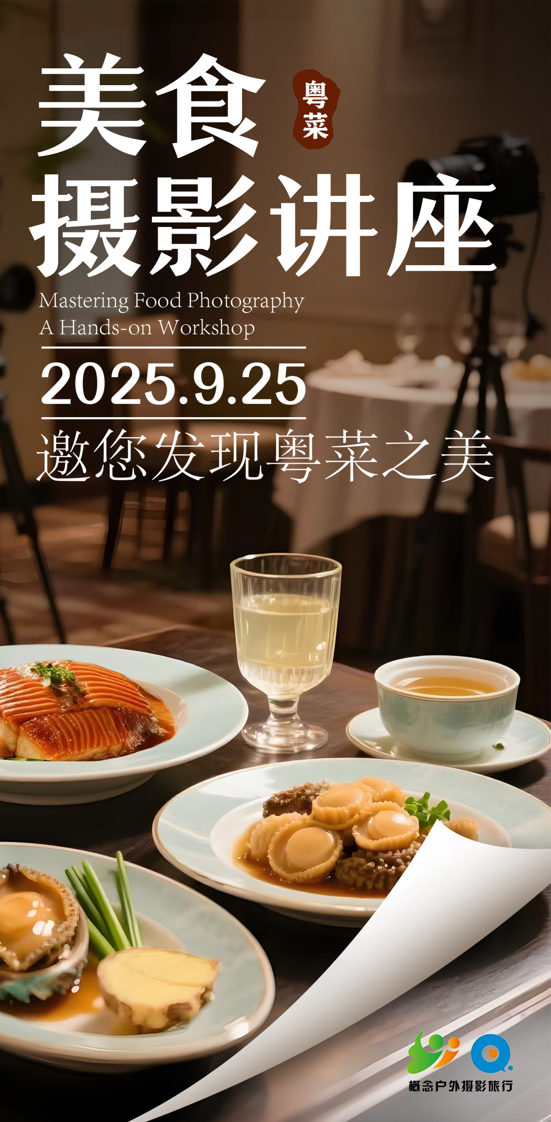 概念户外摄影旅行的老朋友们:咱们概念户外摄影旅行陪伴大伙儿 21 年了!我们一起看过春天的婺源梯田、秋天的坝上草原,早就是相亲相爱的 “大家庭”为了回馈新老朋友,我们将于9 月 25号(周四)10:30-13:30,来一场 “好吃、好学、好聊” 的聚会,老朋友们可别错过了!  2004  2025 美食发现粤菜之美 The Beauty of Cantonese Cuisine粤菜作为中国八大菜系之一,底蕴深厚又具多元魅力,由广州菜、潮州菜、东江菜组成 —— 广州菜求清鲜嫩滑,如白切鸡原汁原味;潮州菜善烹海鲜,像卤水鹅卤香十足;东江菜偏肥咸熟,梅菜扣肉堪称经典。它选料广而精,烹饪手法多样,更讲