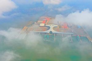航拍视角下,徐闻港综合交通枢纽大楼形如展翅鲲鹏,红白相间的建筑群与琼州海峡的碧波形成强烈视觉冲击,象征“海上丝路”的腾飞之势