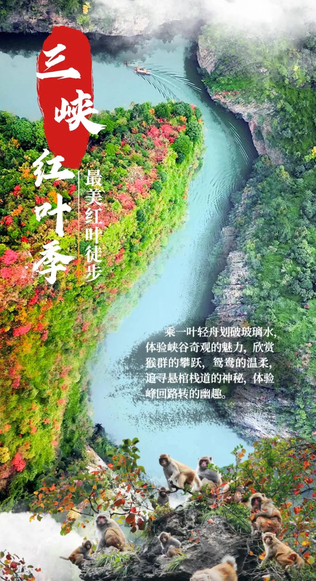 三峡红叶遍布整个长江三峡流域,观赏期长达3个月,仲秋时五彩缤纷,晚秋时层林尽染,初冬时一片火红。