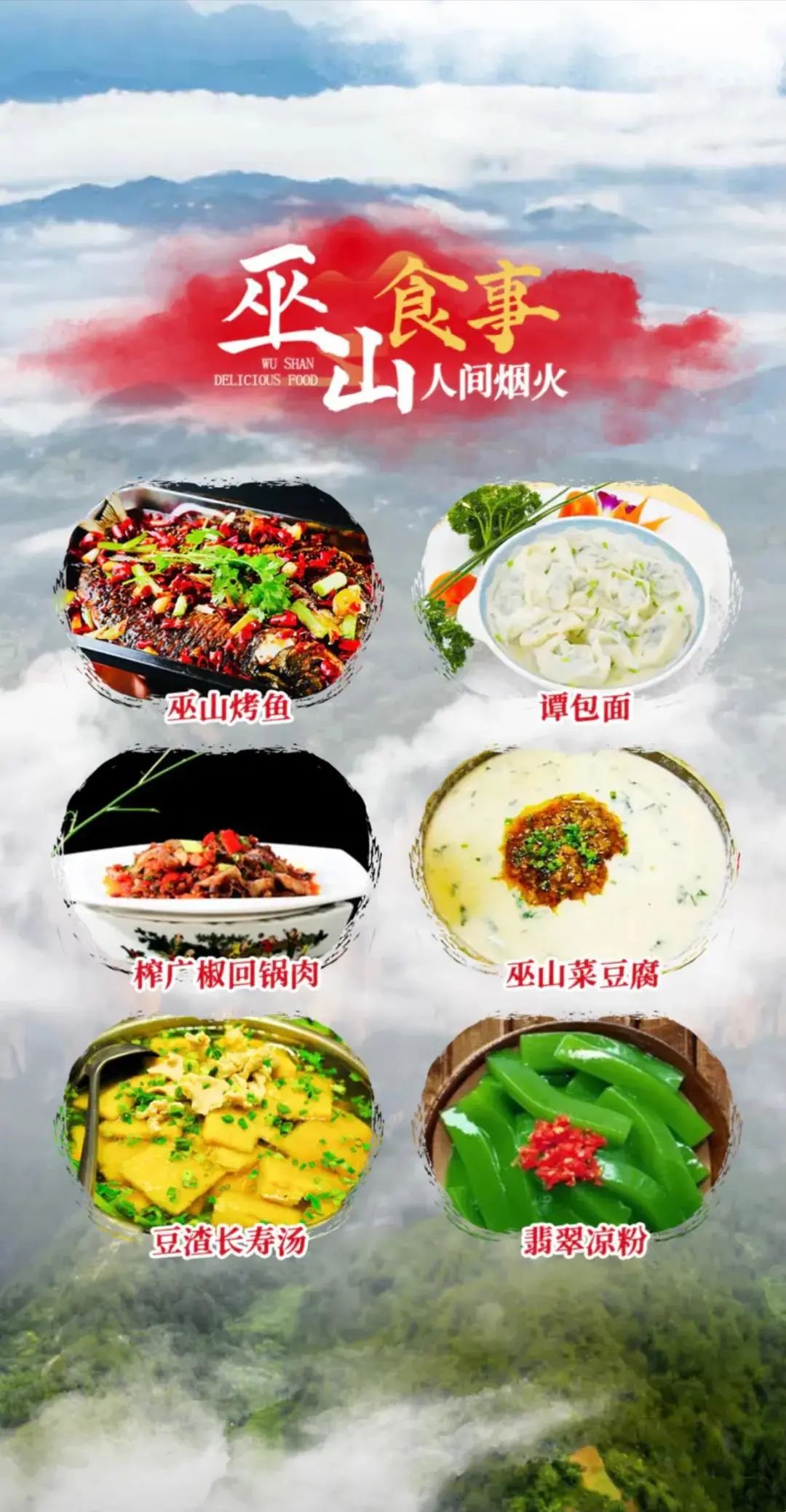 来到巫山,除了让红叶美景惊艳你的视觉之外,当然也不能亏待味蕾,必须要尝尝巫山的美食!这里有:巫山县烤鱼--全国烤鱼做法的发源地,1700多年前的味道;腊香软糯味浓的腊蹄炖洋芋果果;纯天然的养生菜--翡翠凉粉