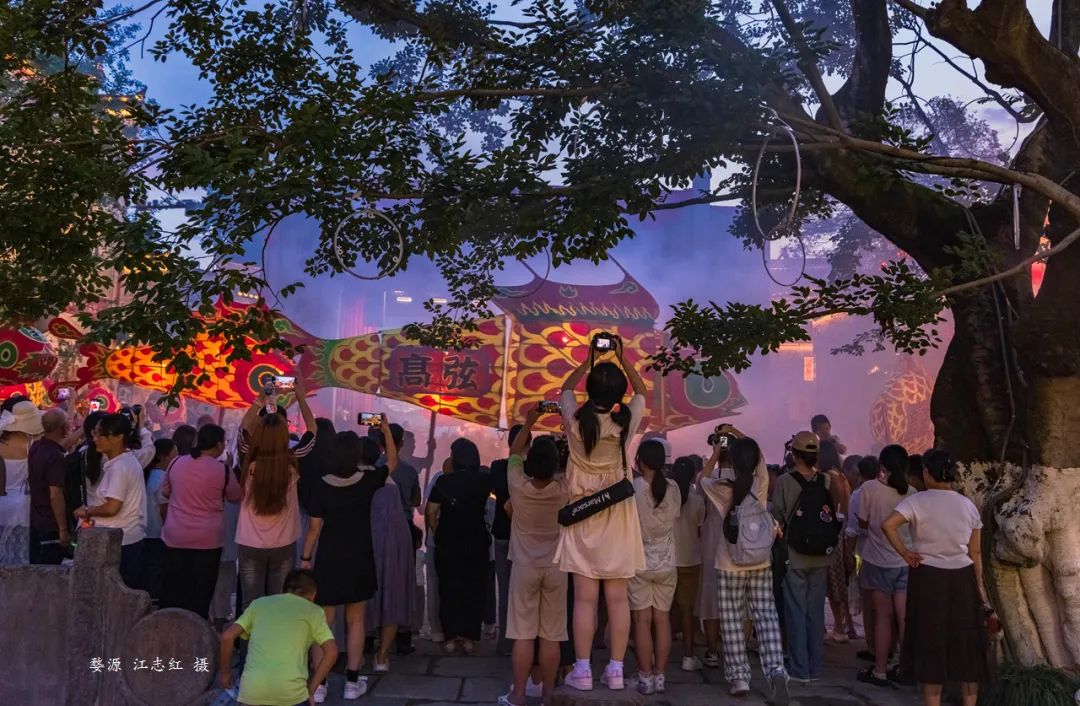 西湖凼街区汇聚了星江饭店、婺源老食品厂、徽州老馄饨、老城豆腐坊等20家老字号,打造“舌尖上的婺源”美食矩阵。同时,甲路伞、华龙木雕、查酒等非遗传承人现场展示传统技艺,让游客近距离感受徽州文化的魅力。市井巡游、非遗花灯、街头快闪、NPC互动等沉浸式演出“白+黑”轮番上演,重现宋代《市郎图》中的生活场景,让游客仿佛穿越千年,置身于繁华古街。
