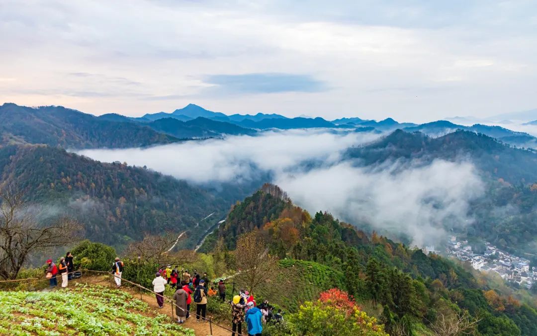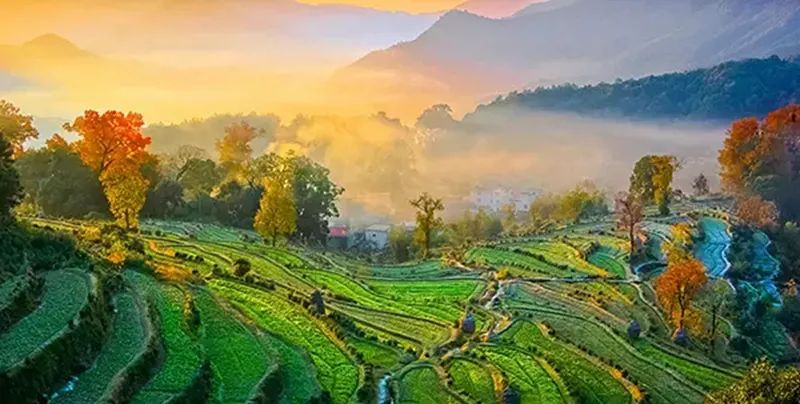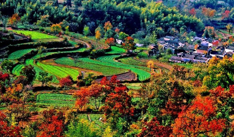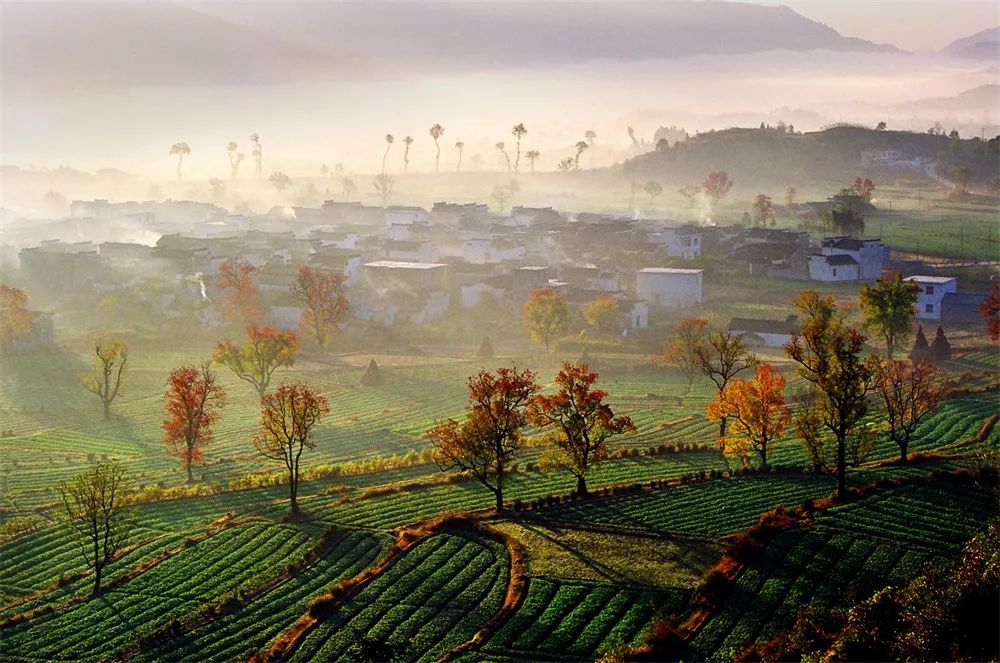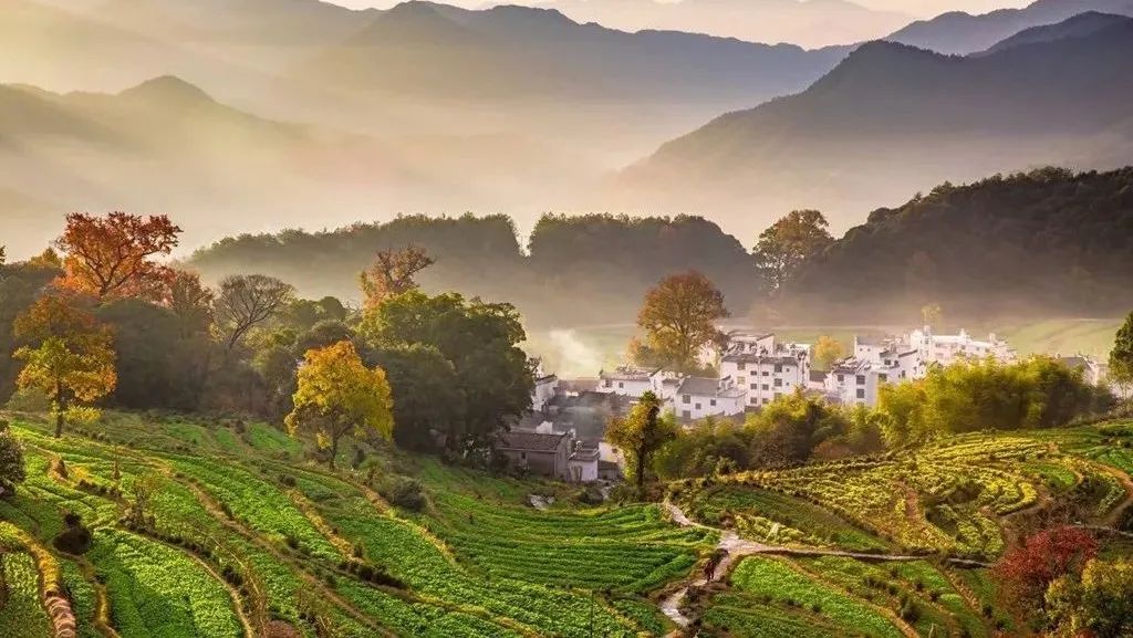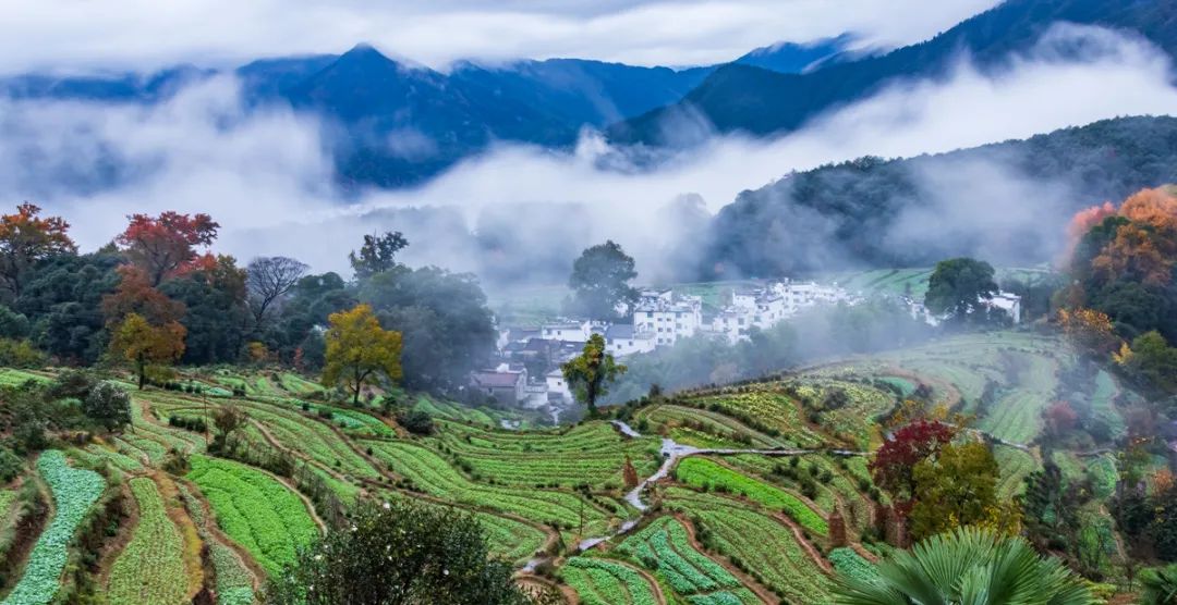 在海拔千米的高山上;梯田如链似带,层层叠叠,高低错落,壮丽雄奇;梯田下面,山窝里藏着一小撮粉墙黛瓦分外温柔可亲,云雾缭绕,若隐若现的粉墙黛瓦,红枫乌桕相映,构成了一副极美的婺源农村风光画卷。