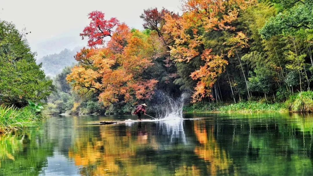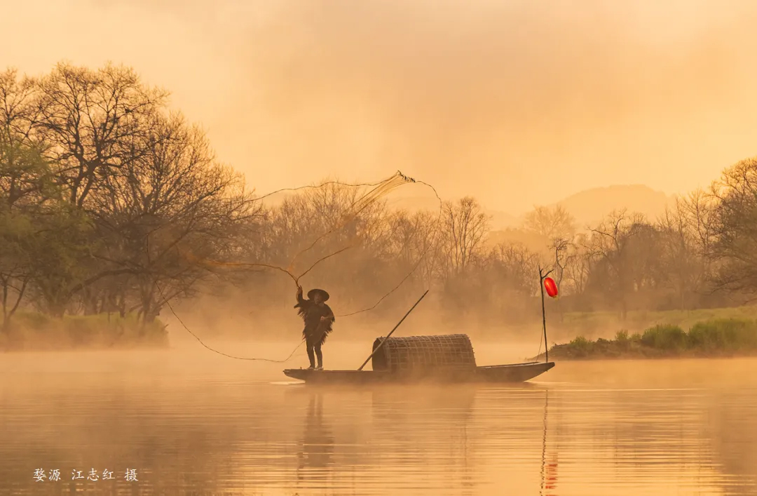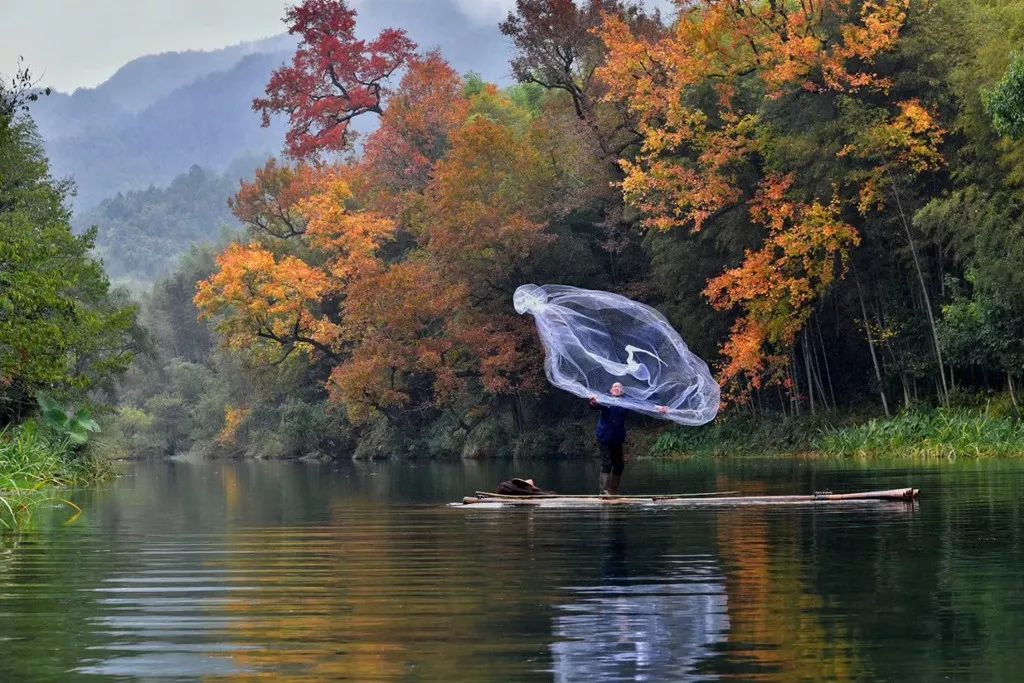 1、 上午:早起前往拍摄【江岭晨雾】秋天的江岭令人陶醉。层层叠叠的山峦,在晨雾的映衬下,似一幅色彩浓重的油画,江岭的秋色也是惊艳了国内外摄影人。初晨梯田如链似带,层层叠叠,高低错落,山窝里藏着一小撮粉墙黛瓦分外温柔可亲,云雾缭绕,若隐若现的粉墙黛瓦,红枫乌桕相映,构成了一副极美的婺源农村风光画卷。)--早餐后前往【龙尾】拍摄火红的红枫及红枫倒影、河流、竹筏、渔夫、古民居等田园风光,安排竹筏渔夫场景表演配合拍摄,每到秋季,村边的红枫和绿莹莹的河水交相辉映,加上渔船的点缀,形成了一幅艳丽的秋色之画。完毕沿途拍摄,高速路口农家午餐。