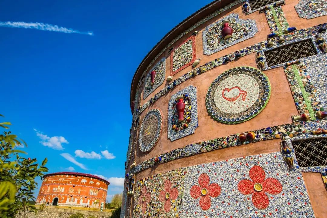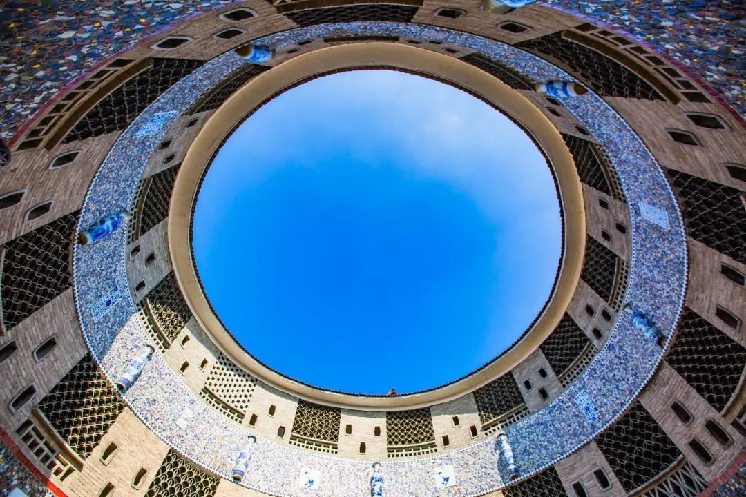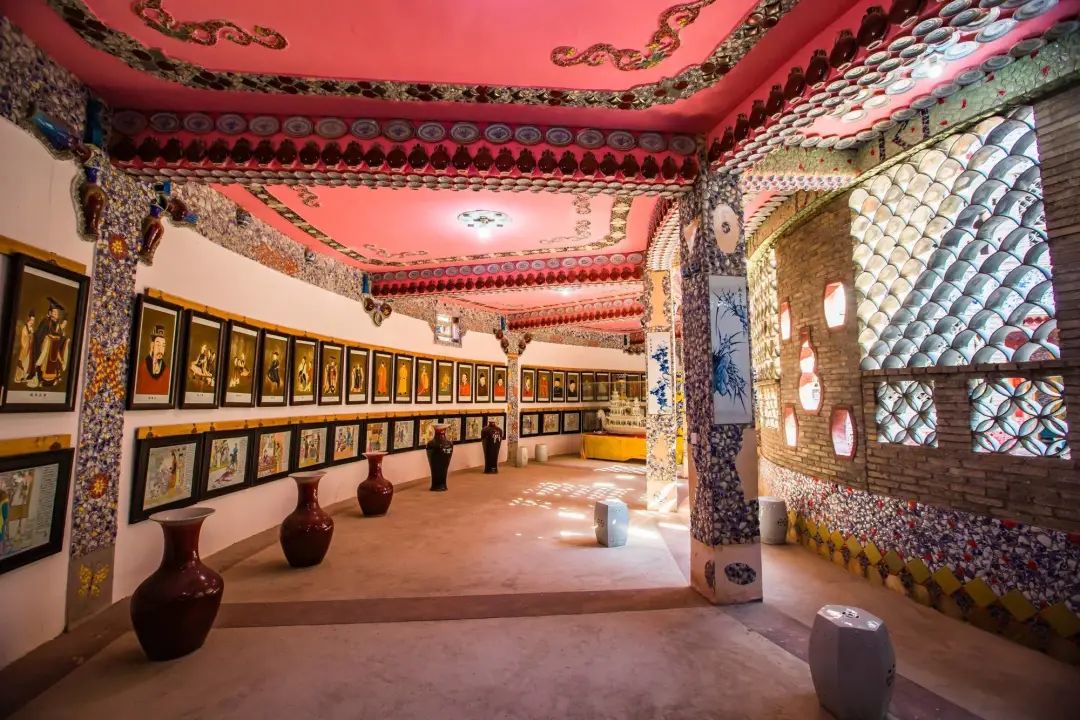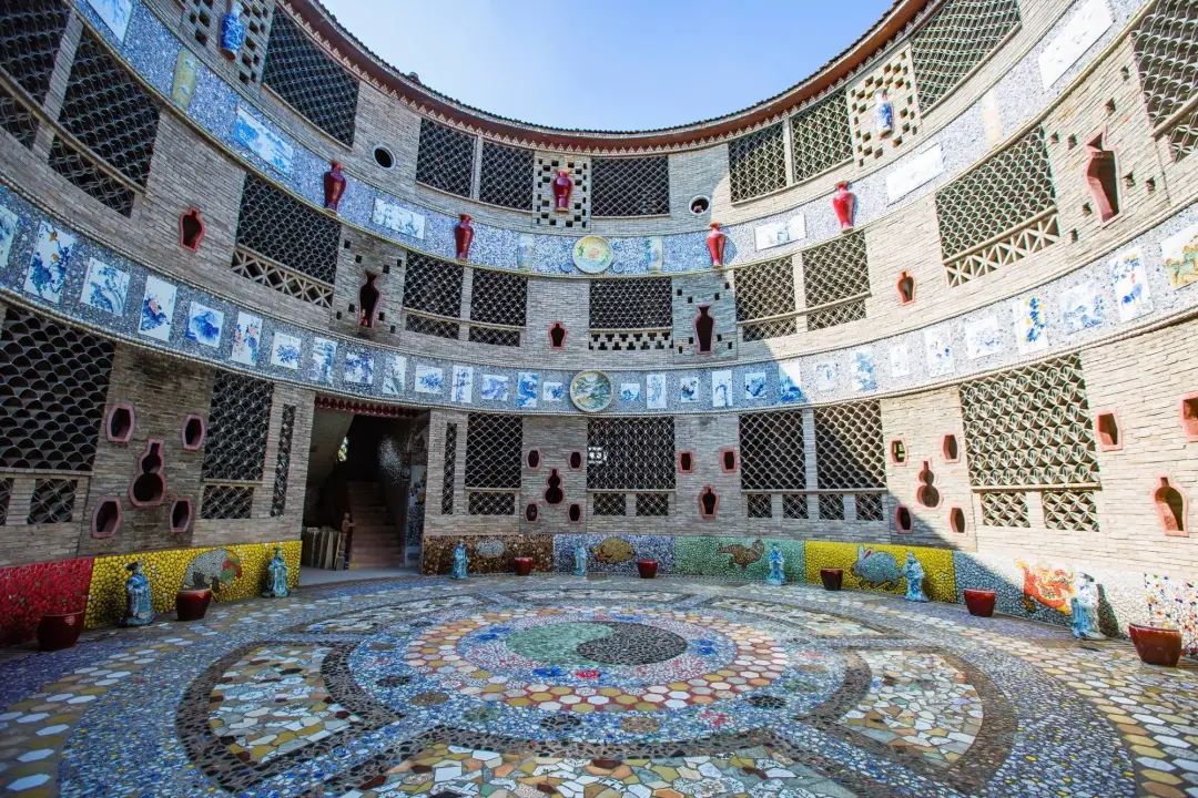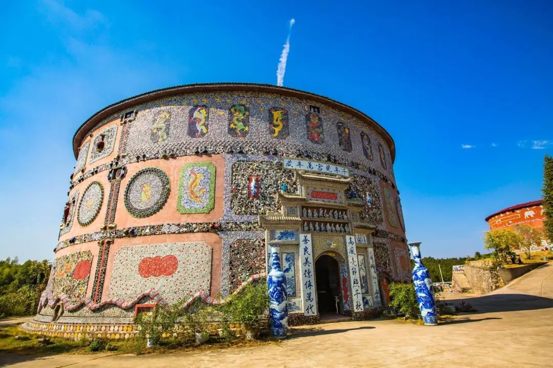 这是一个令人惊叹的地方,一位90岁老人缔造的的奇迹。楼里的七彩瓷片,都是用完整的瓷器打破后镶嵌,没有一点舍不得。装饰所用瓷器都是老人数十年积累之物,其中多为上世纪80年代柴窑烧制,不乏精品。瓷宫外形仿福建客家圆楼建筑模式,外墙上镶嵌了青花、玲珑、粉彩和颜色釉等各色瓷器,各种造型,琳琅满目。如今的瓷宫以其新奇创意和靓丽外形吸引了许多游客前来打卡,成为远近闻名的热摄影打卡点,也成为景德镇的代言建筑。