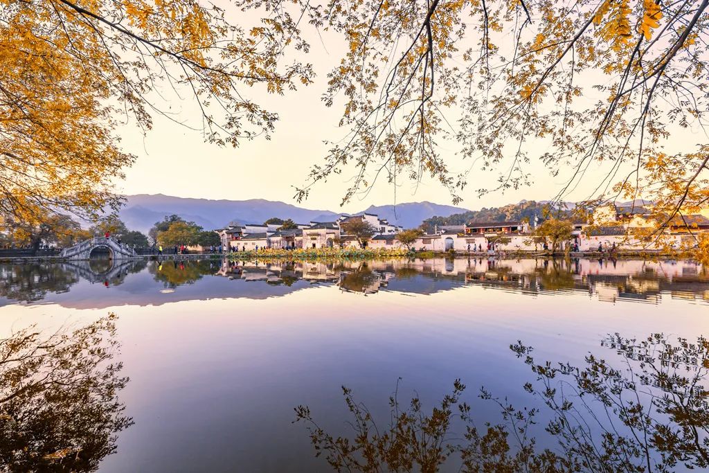 2、 下午:途经【奇墅湖】拍摄多彩秋林,秋色倒映在湖面上,落羽水衫奇美無比。前往【宏村古镇】拍摄南湖、月沼、承志堂、徽派建筑马头墙、石拱桥、石板路、古巷民居等。傍晚拍摄蓝调下月沼和南湖夜景,为方便拍摄夜景,晚餐自理,(不想进宏村拍摄的老师可以在周边自由活动),完毕返回酒店入住休息。