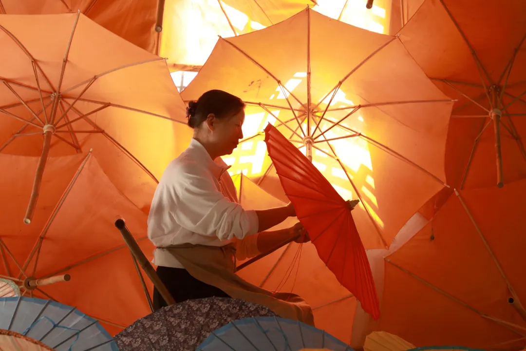 匠人们沿用古法工艺,以竹为骨、绸纸为面,手绘花鸟、山水或仕女图。当阳光透过撑开的油伞,伞面图案在光影间流转,仿佛打开了一幅流动的徽州画卷。
