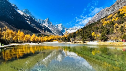 每年9月至10月底,是这里最佳的摄影季节。金黄的落叶松、火红的枫叶与洁白的雪山、碧蓝的磐羊湖、龙王海同框,色彩绚烂到极致,是拍摄大场景风光片的绝佳之地。