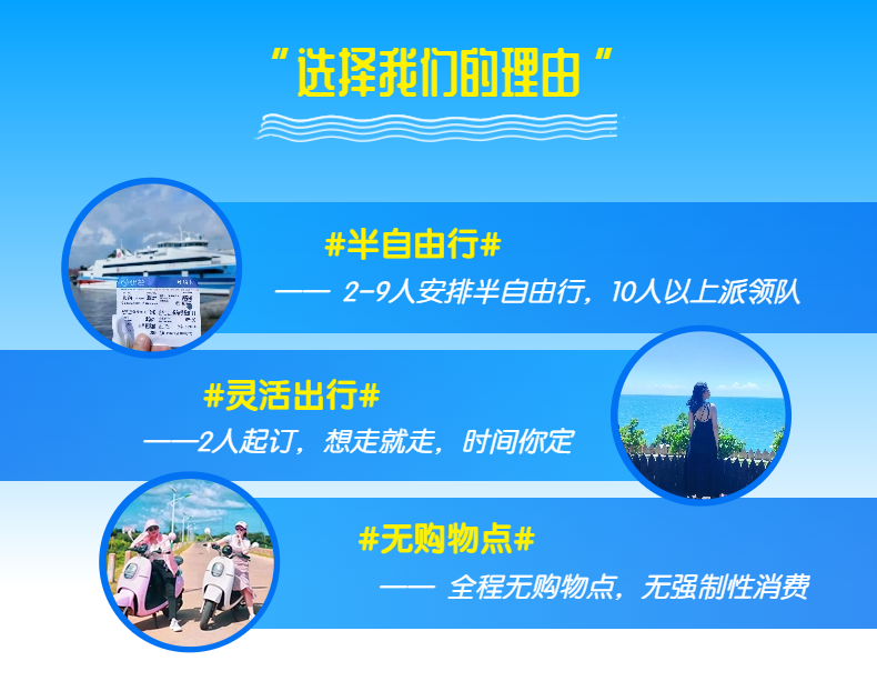 8、2-9人司机兼领队安排自由行,10人以上派领队(根据潮汐/天气情况合理规划行程,灵活调整游玩顺序);
