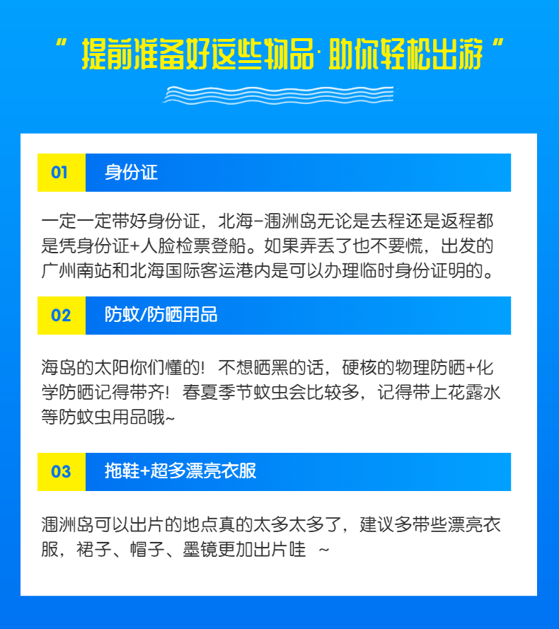 1、广州南-北海动车车程约5个小时,出门前记得吃早餐,准备一些干粮在高铁上用午餐,检查随身物品,特别是身份证件;