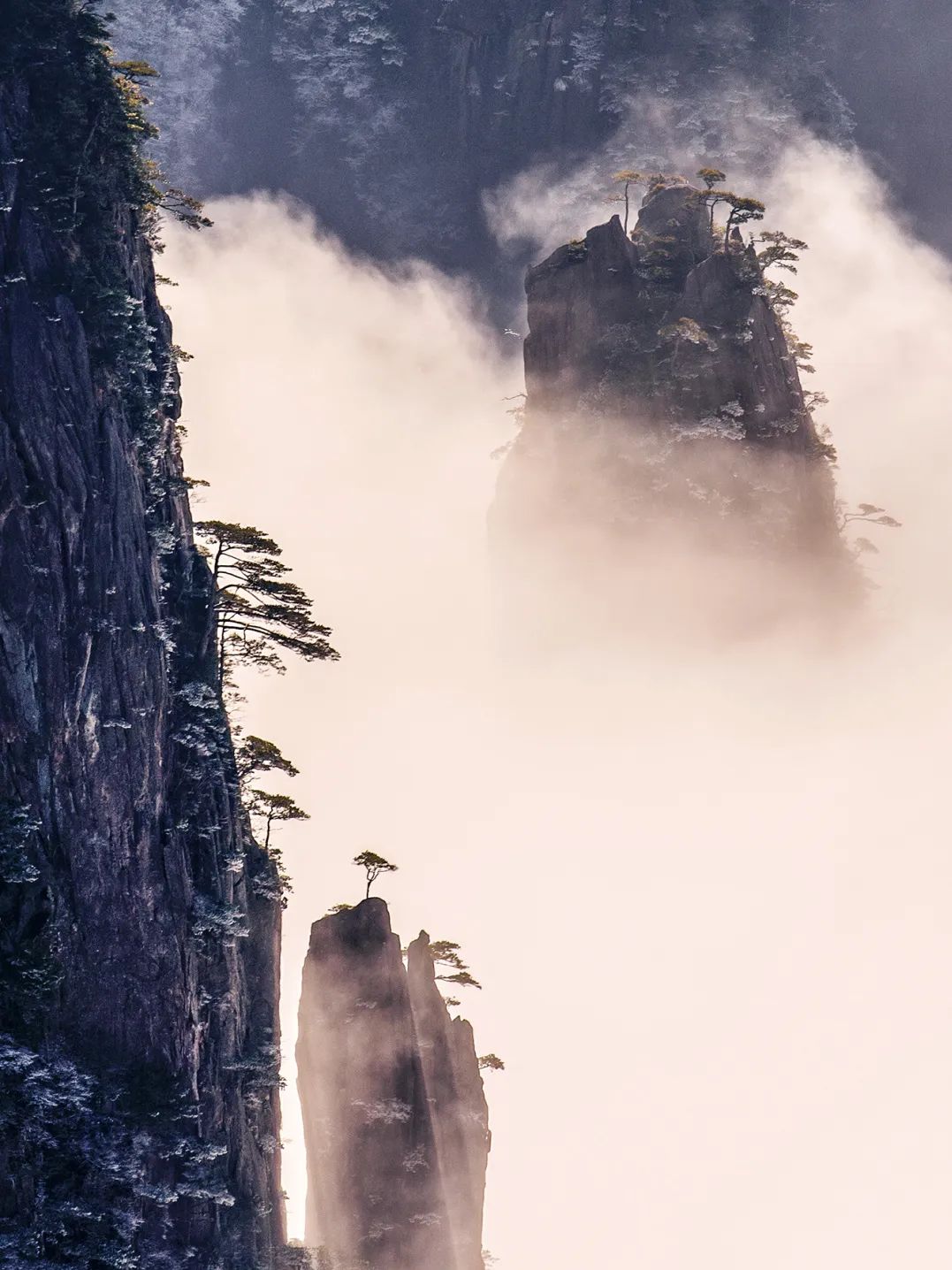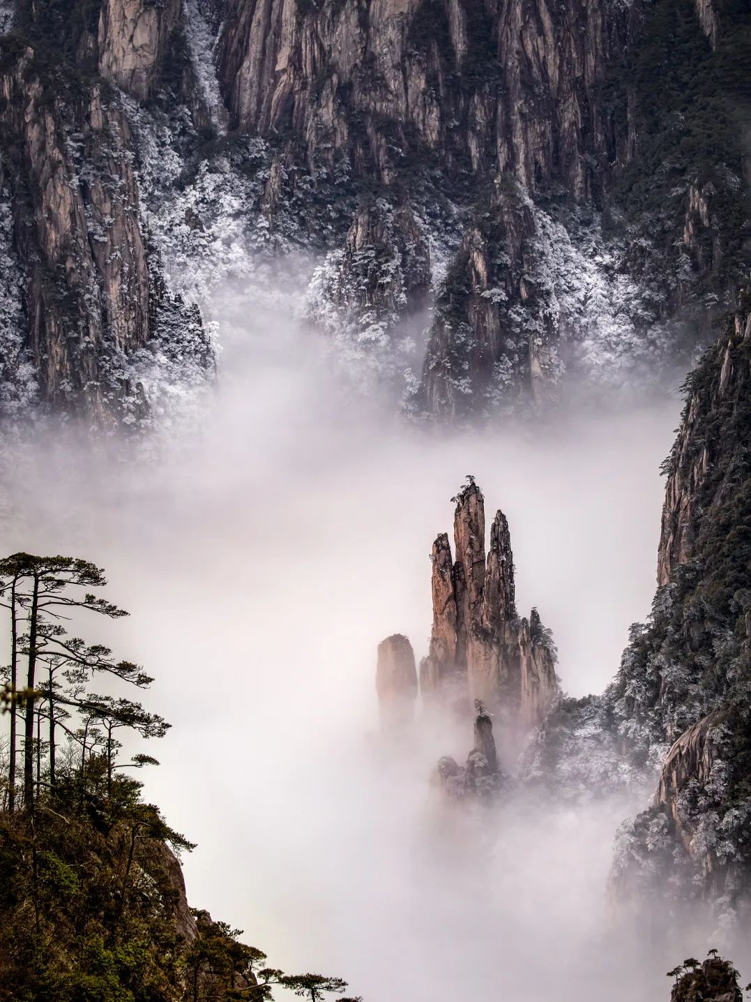 黄山从每年的12月至翌年2月为最旺雪期,相对也是黄山的旅游淡季,游人相对少好多,而云海在冬季出现的概率有要远远高于夏季!此时正是拍摄黄山雾凇、雨凇、冰挂的好时节