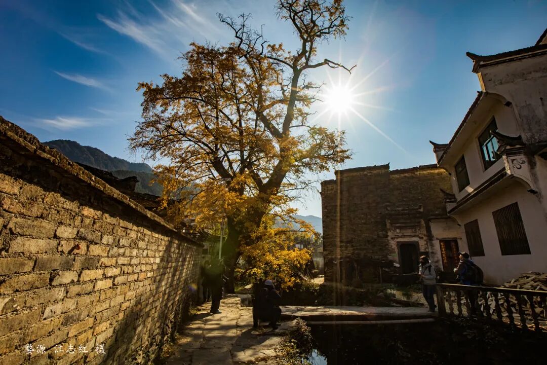 上午:早起前往【石城】观景台,拍摄日出晨雾下的千年古红枫粉墙黛瓦徽派民居、晨曦中袅袅炊烟等天人合一的乡村美景。古村落前后因千年高大的枫树环抱,晨雾时悬挂树腰,当一缕缕阳光洒向晨雾中,呈现出如流金般的美丽。此时傲霜红枫、徽派白墙黛瓦在晨雾中若隐若现,犹如一幅意境深远的山水画,呈现出梦境般的世外仙境,令人陶醉其中,美不胜收!每年都会吸引大批摄影爱好者及游客前来拾秋取景。早餐后后前往“中国最圆的古村落”【菊径村】,拍摄菊径村经典全貌(带上超广角或鱼眼俯拍,广角头最好带上)、廊桥和宗祠古村落、小桥流水人家等,沿途拍摄农家午餐