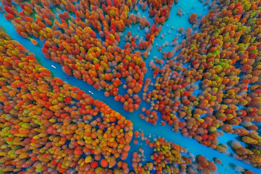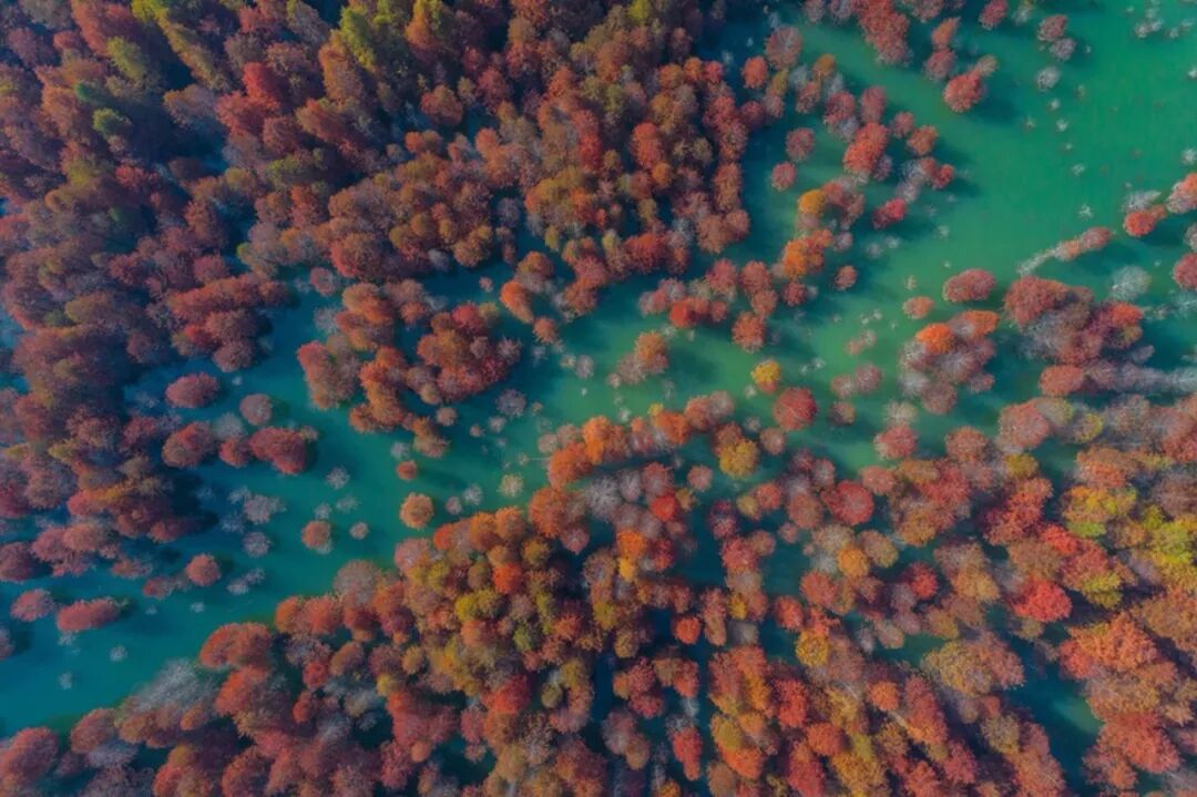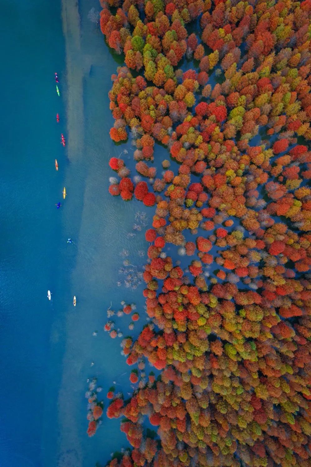 宁国落羽杉林,二千余亩红杉林密集地生长在水中,与宽广碧绿的水面相互映衬,就像一顶天然的帐篷。清晨透过树叶缝隙折射的阳光,洒落在水面,薄雾在林间流淌,如水一般,非常美。泛舟于千亩水杉林之间,沿着浅浅的湾流,穿梭于红叶树林,人与自然相互融合,秋景迷人,却没有常规团队,不得不说这是私享的独特美景。随着秋色渐深,红杉林渐次变红、浅红、深红、金红,各种颜色相互交织着,倒映在清澈明净的水面,更是美得不可思议,恍如北疆的喀纳斯风光。水杉林的光效果也特适合人像自拍,别说我没告诉你哦!