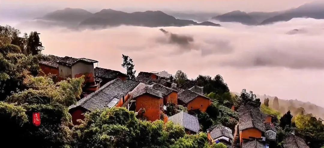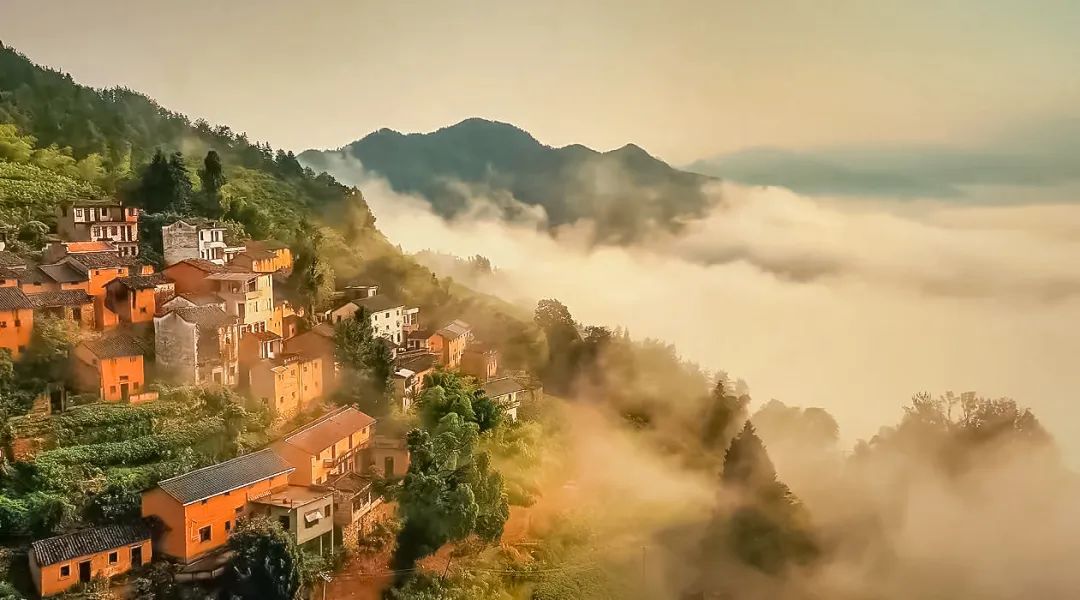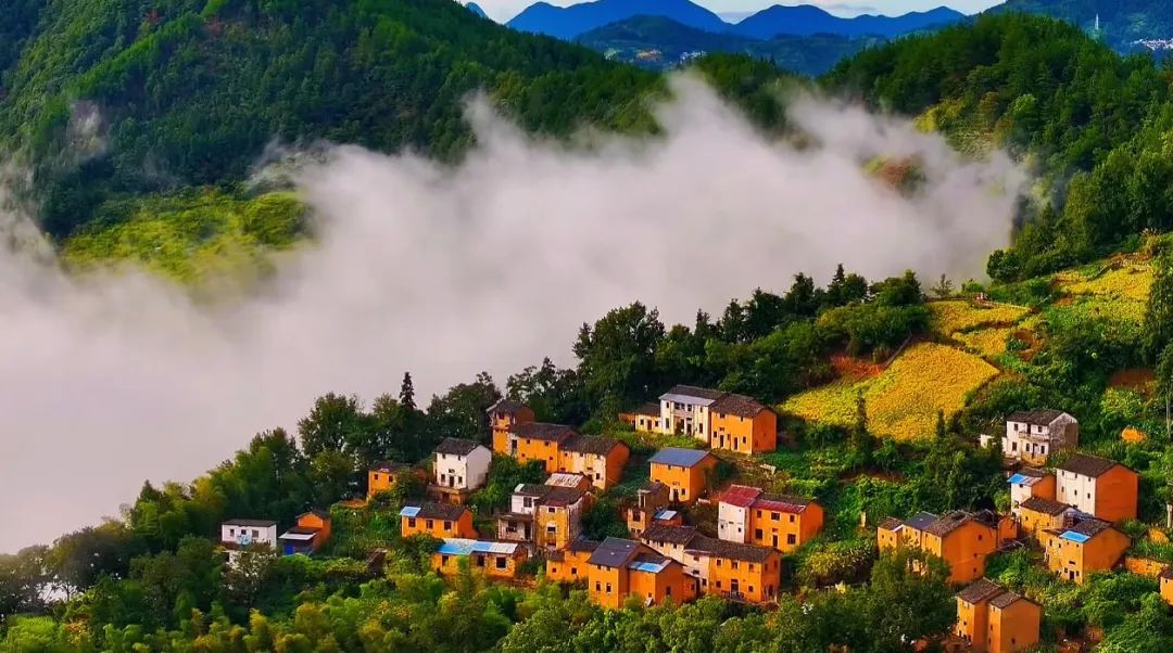 在海拔千米的高山上;梯田如链似带,层层叠叠,高低错落,壮丽雄奇;梯田下面,山窝里藏着一小撮粉墙黛瓦分外温柔可亲,云雾缭绕,若隐若现的粉墙黛瓦,红枫乌桕相映,构成了一副极美的婺源农村风光画卷。