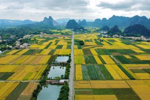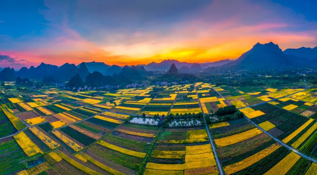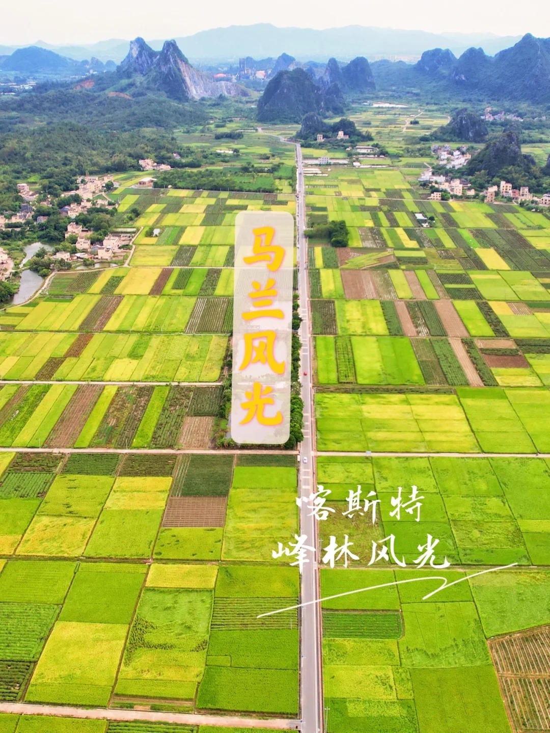 典型的喀斯特地貌田园风光,峰林如笋,倒映在春水之中,晨雾弥漫时宛如水墨画。适合广角大场面风光,航拍,或长焦拍摄山峦叠嶂,或低角度捕捉农夫耕作的剪影。
