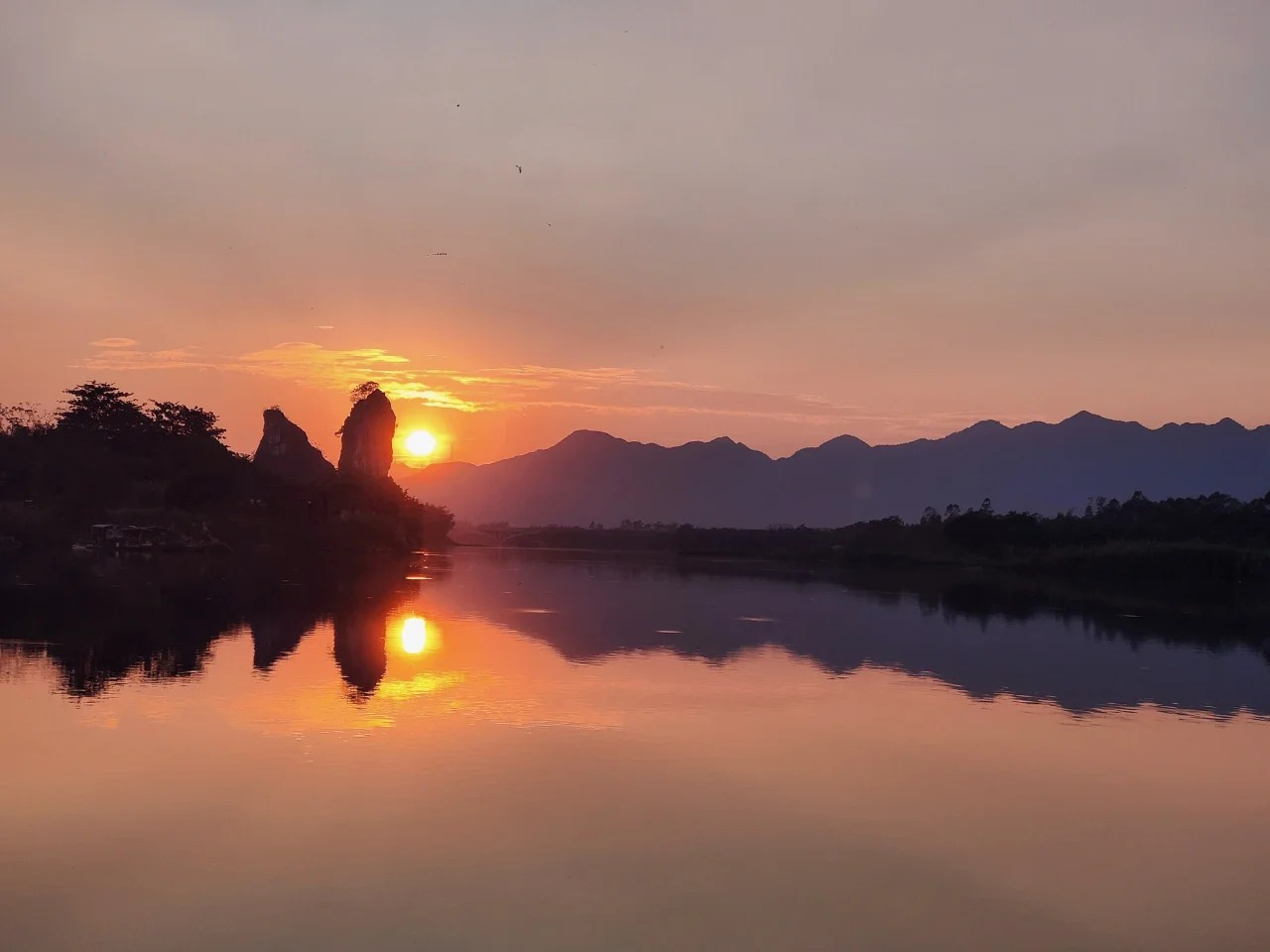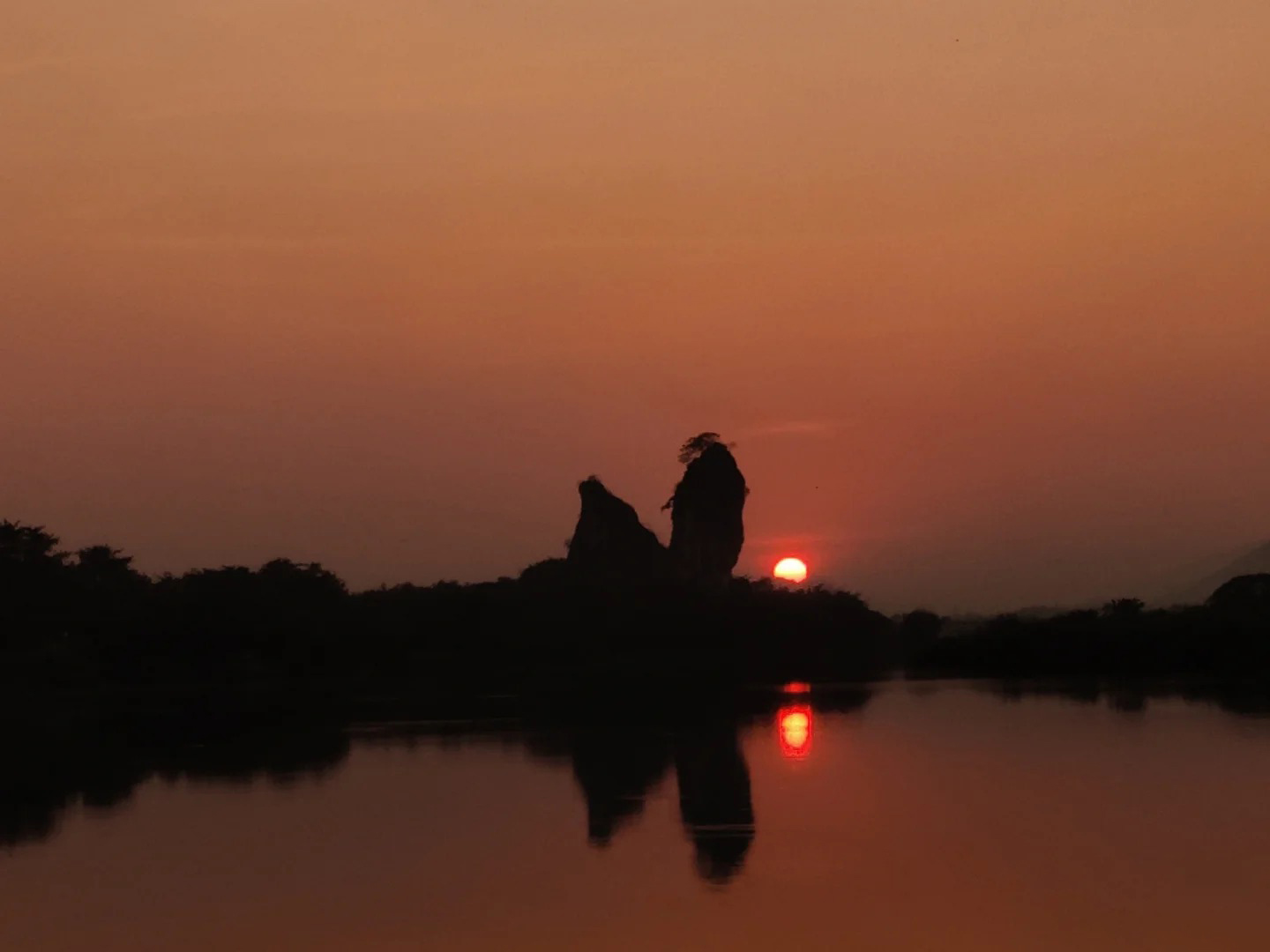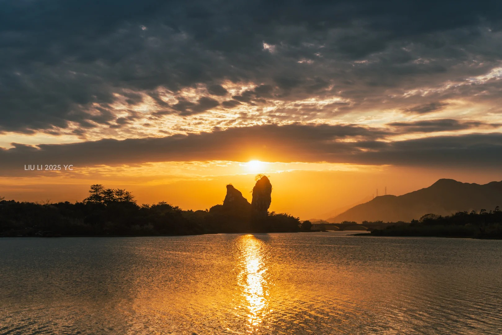 鱼王石日落,阳春八大景之一,秋冬季节,太阳落在高低峰之间,整个江面金光闪烁……