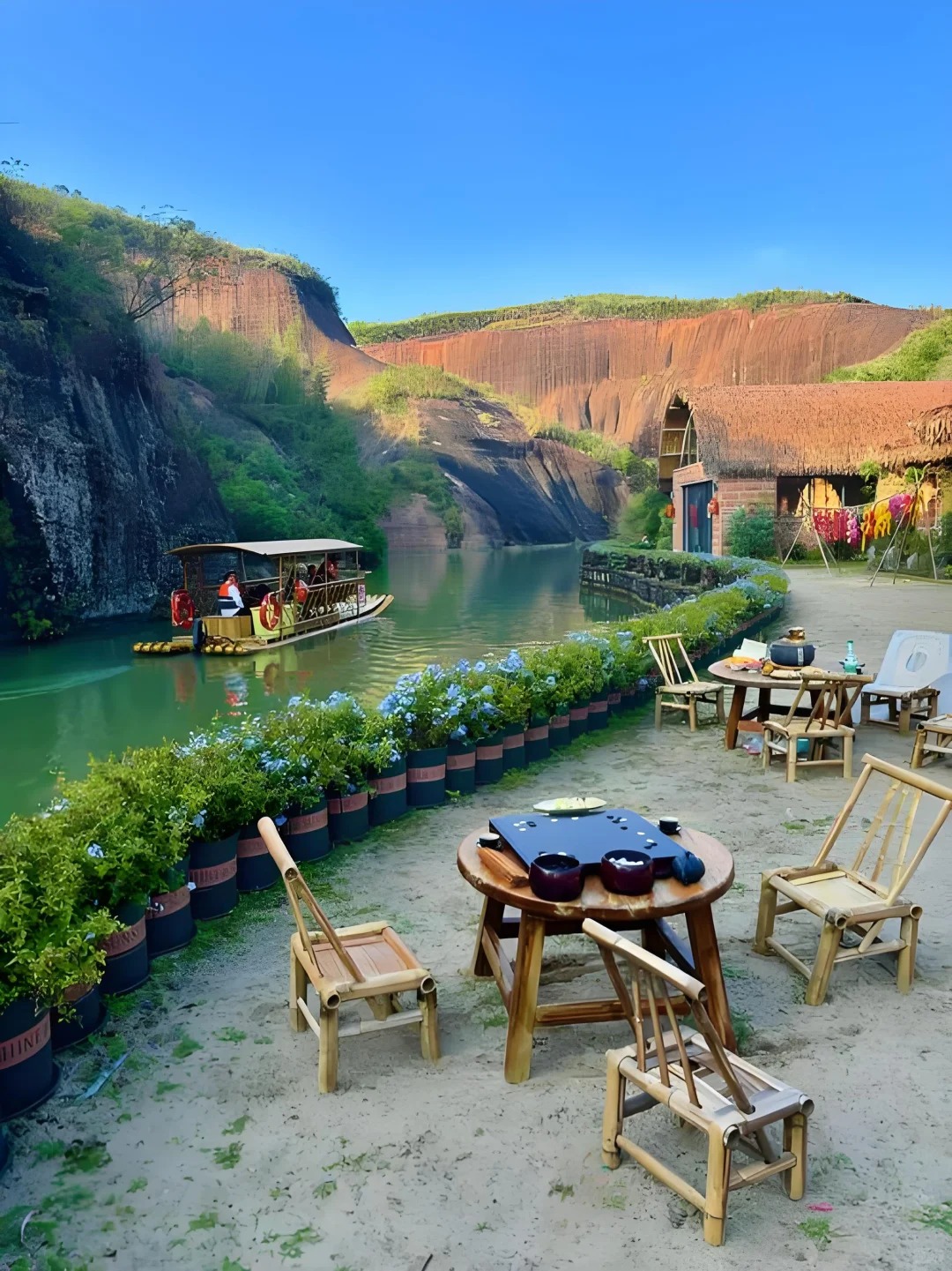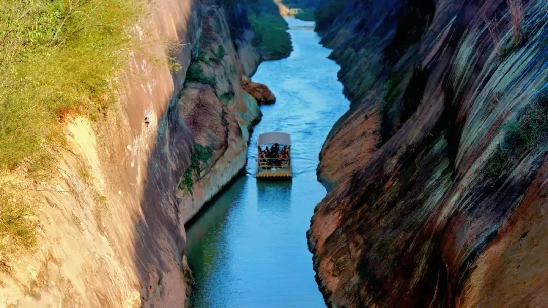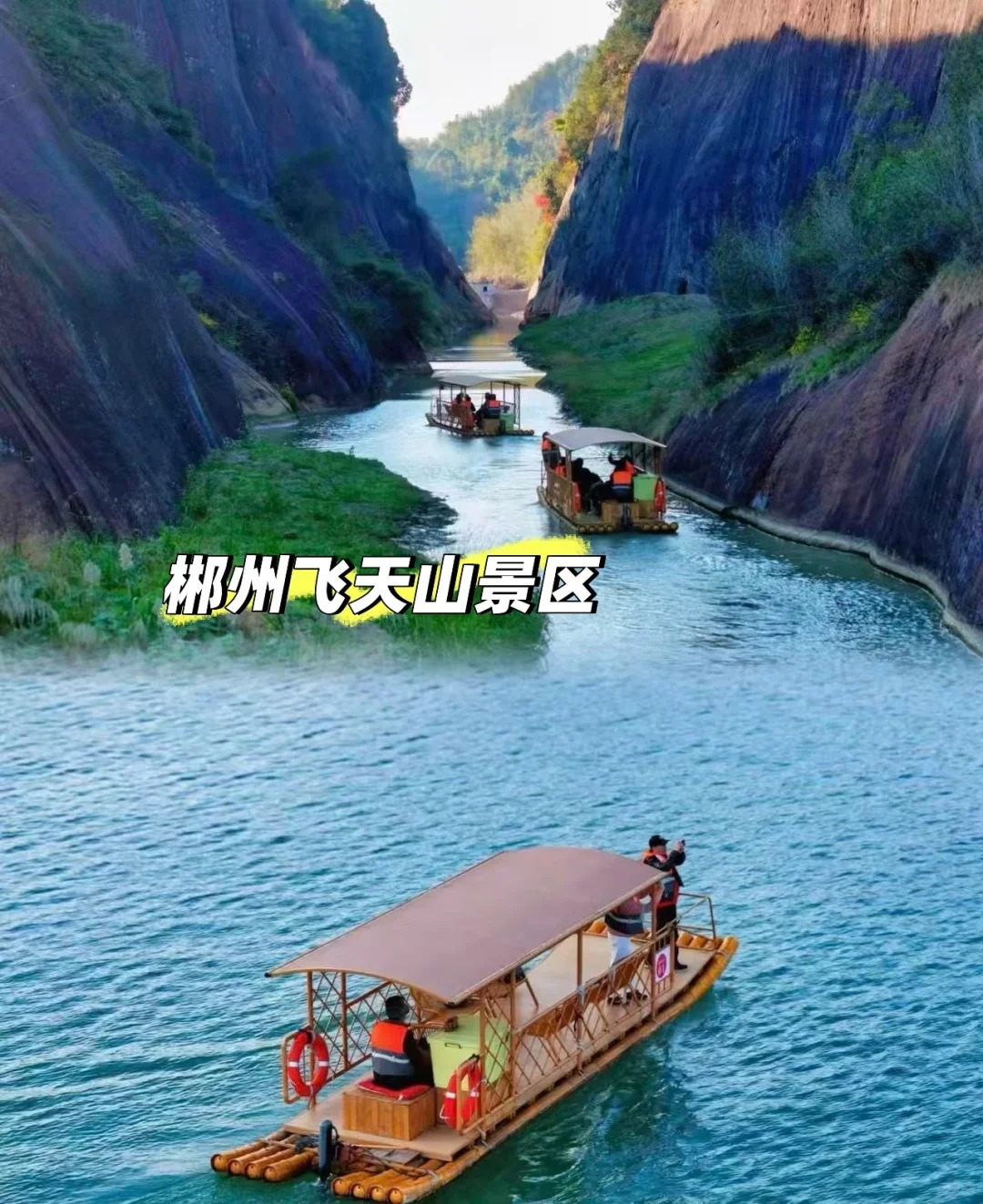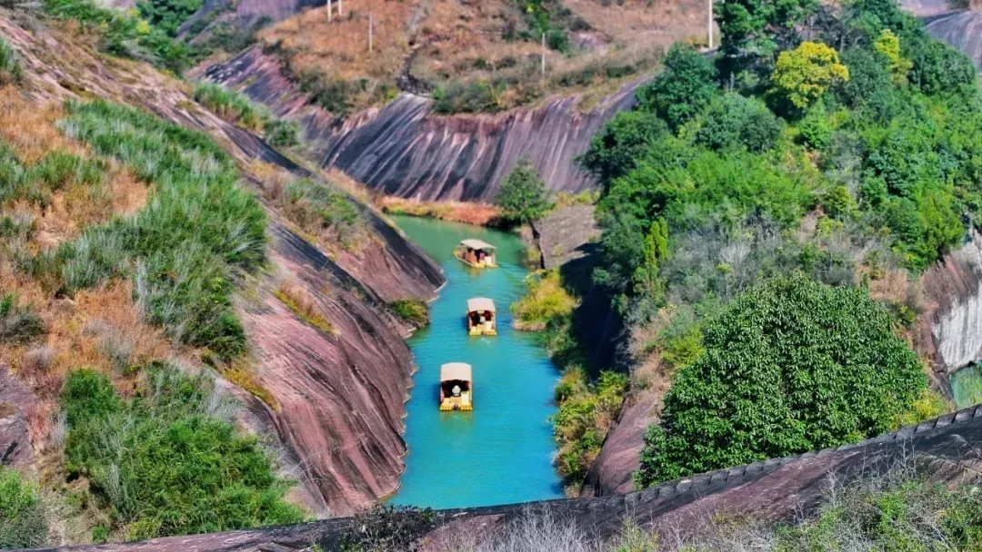 乘坐竹筏在飞天山的碧水丹霞间漫游,是感受郴州山水之美的独特方式。从大面洲码头出发,至九龙水寨,沿途可以欣赏到光滑壮丽的岩石山和精致的丹霞地貌画卷,宛如置身仙境。