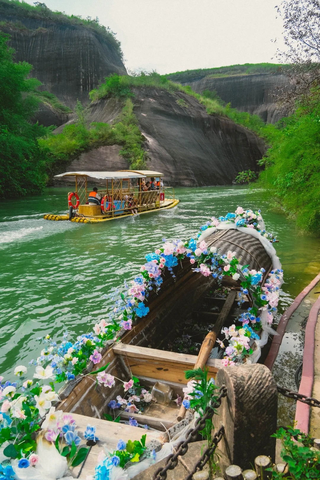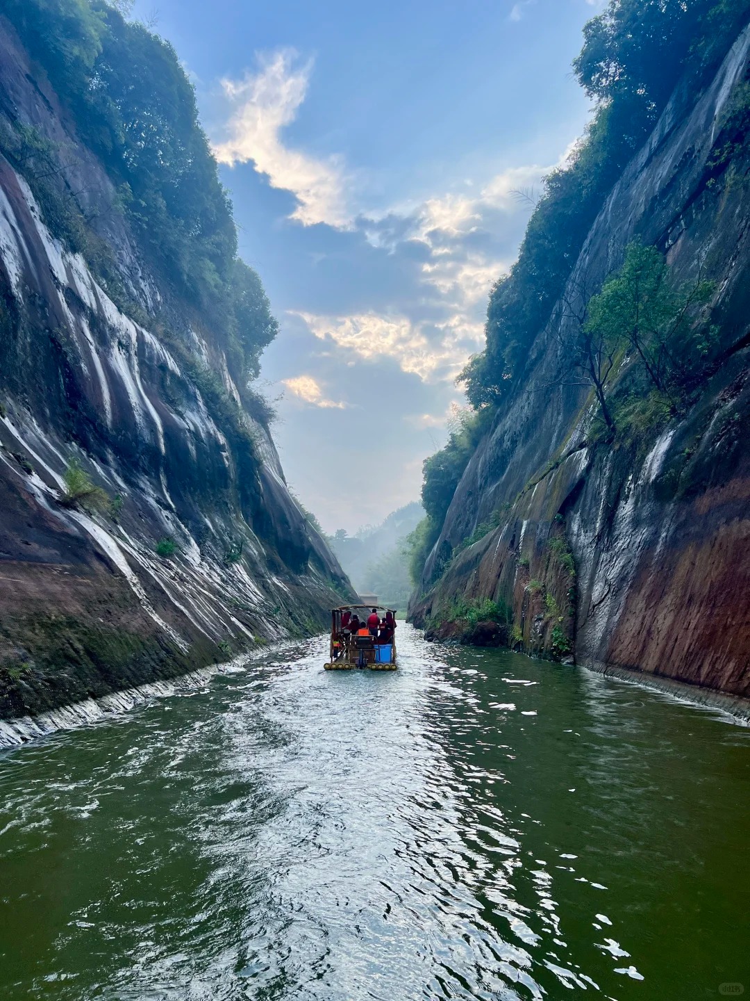 2、退房,适时乘车前往【飞天山九龙水寨竹筏漂】(竹筏漂流大约35分钟左右)从大面洲码头出发,行至九龙水寨,水寨中游览后,看鲤鱼戏水和千年悬棺,中途可在九龙水寨码头停靠参观。