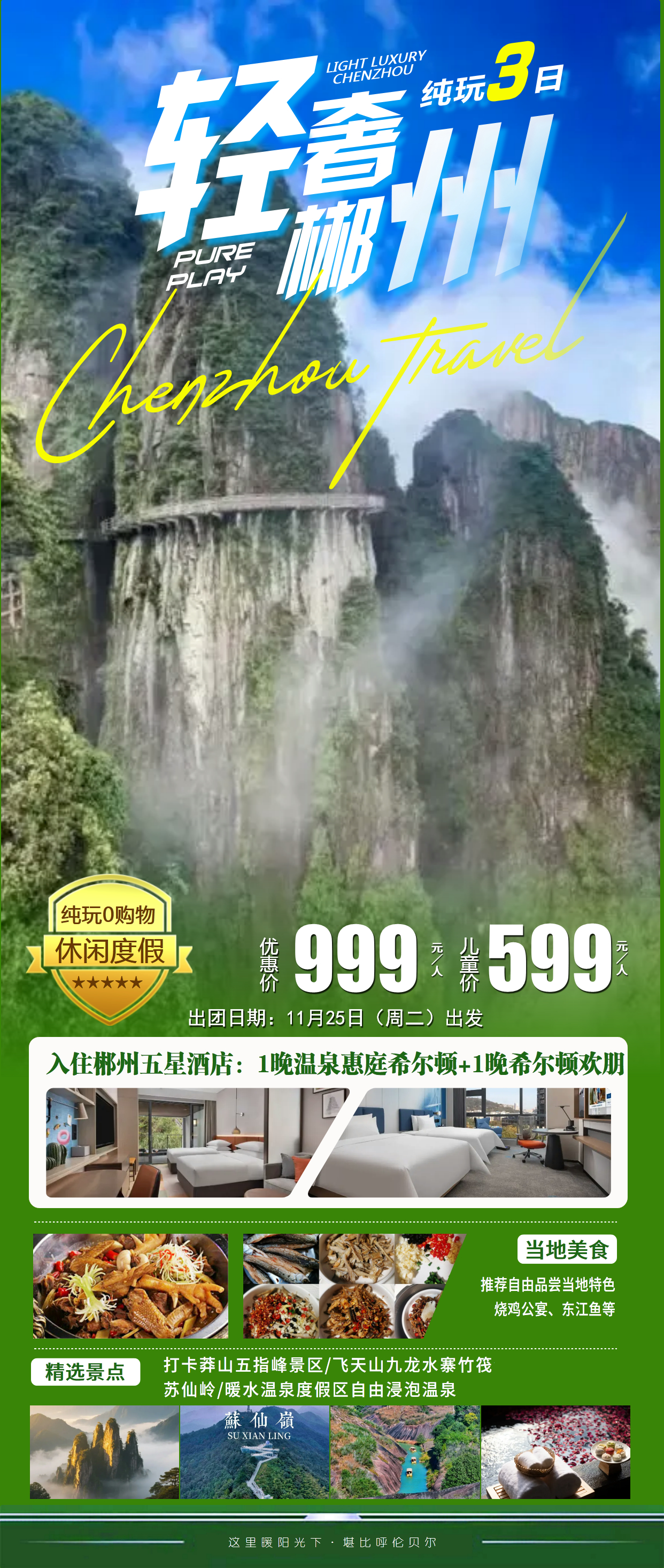备注:建议乘坐索道单线中国最长的观光缆车、中国南方最长的云间栈道、海拨1600米的悬崖电梯(单程40元/往返80元,自愿自理),让您酣畅乐游,移步换景,步步震撼。
