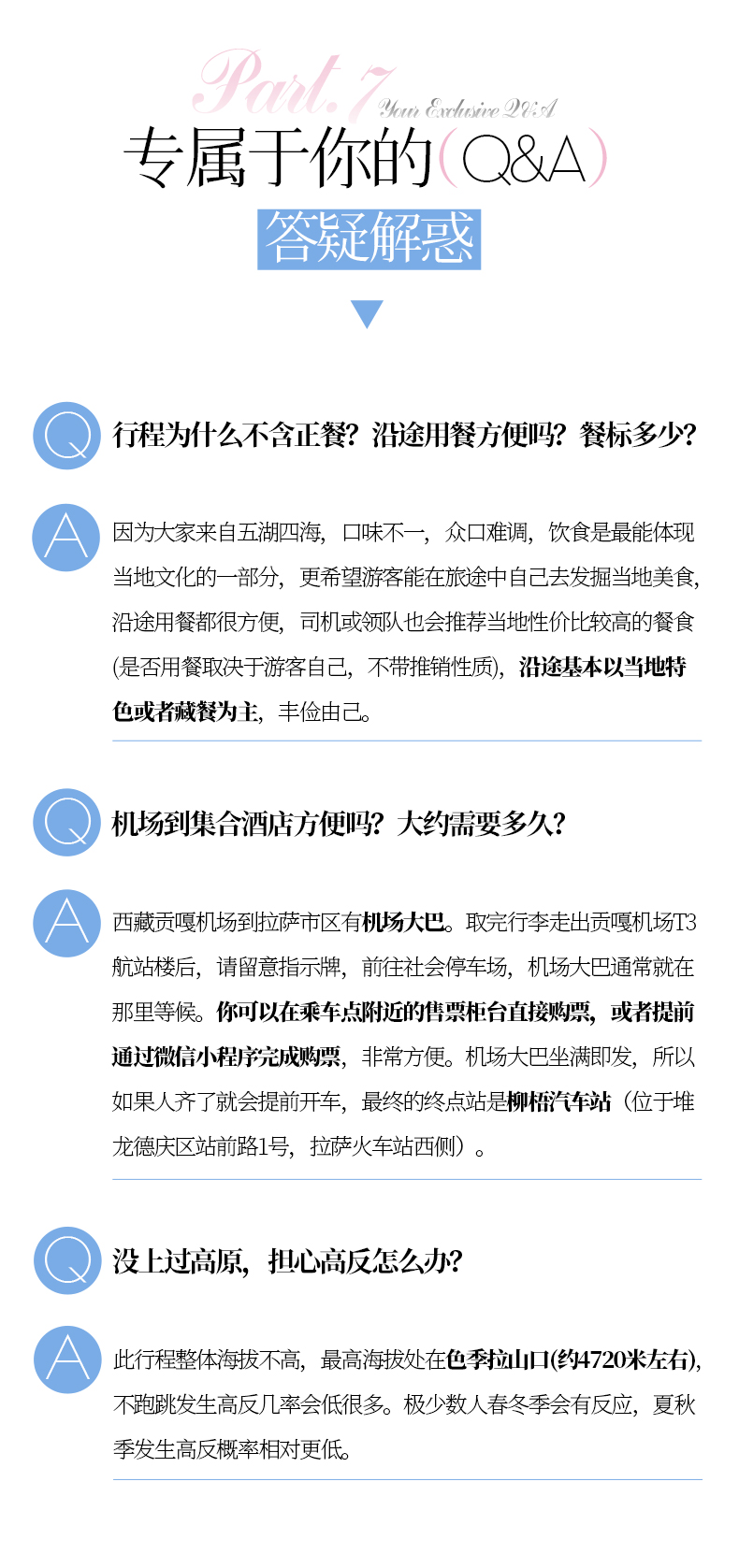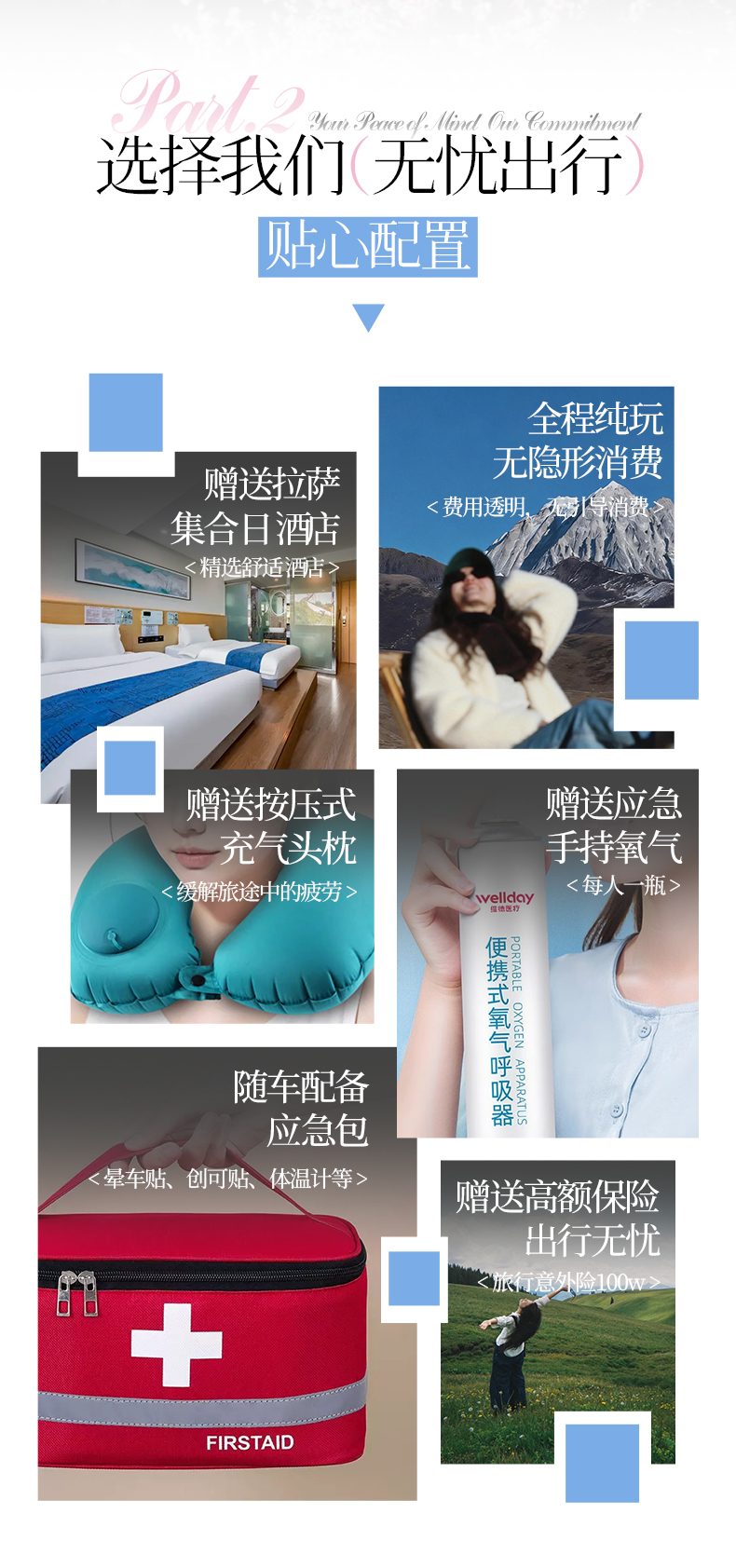 7、领队的职责是会为队员安排住宿,协调用餐,带路,协调控制景区游览时间,在队员遇到危急时刻,为队员协调联系处理各种意外事情。请在报名之前,前往具备资质的医院做全面的身体检查,确保没有影响高原行程的疾病再报名。藏区条件落后,医药条件较差,如果途中突发疾病,医治方面会比较麻烦。领队、驾驶员、酒店老板等工作人员均无行医资质,请不要依赖于工作人员进行救治,如果有不舒服的迹象,请及时告知工作人员,前往最近的医疗点进行医治。特别声明:工作人员”因没有医疗资质,随车只提供瓶装氧气,提供常规感冒药品等,无其他特殊药品,请提前备足适合自己的药品。