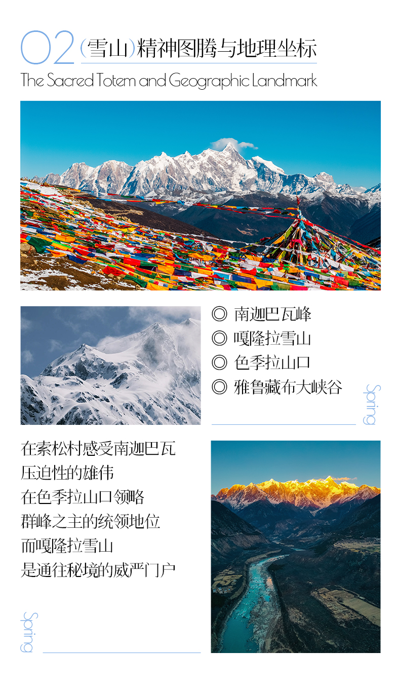 从林芝出发,沿318国道行驶约230公里,车程4-5小时。翻越色季拉山口,远眺南迦巴瓦峰群。之后游览宁静的嘎朗湖或古乡湖,傍晚抵达波密。在海拔4720米的色季拉山口挂经幡祈福。在雪山湖畔欣赏“静好波密”的田园风光。