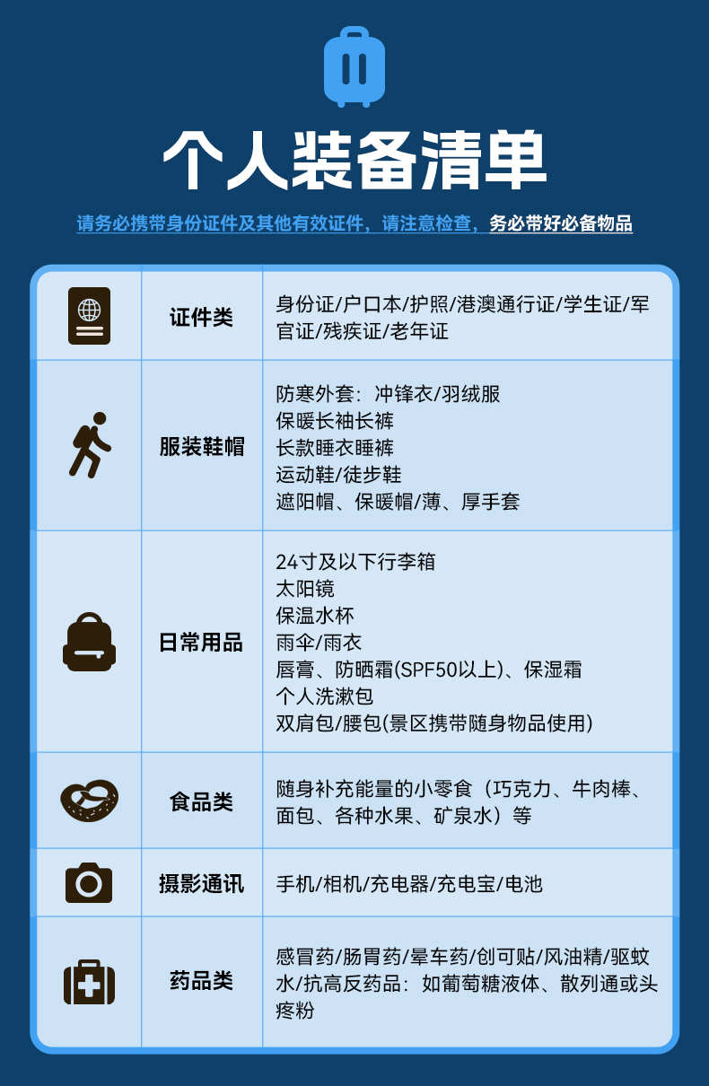 (1)大背包:每人限带一个大背包(60L以下)或者旅行箱(24寸以下)。