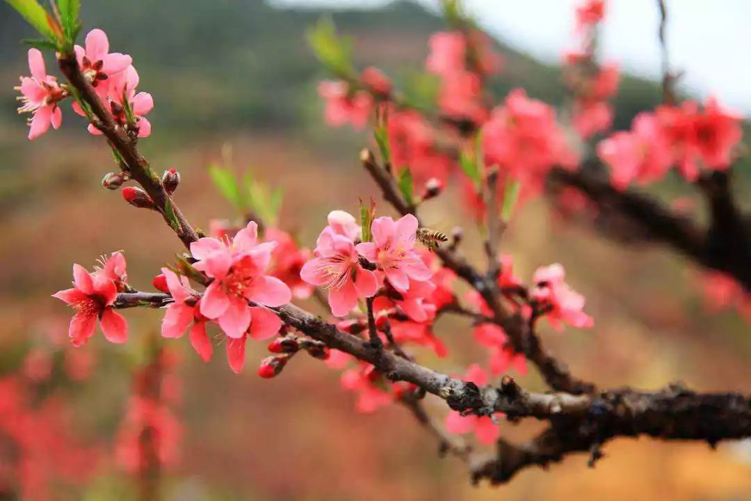 桃花盛开之时,漫山遍野一片绯红。