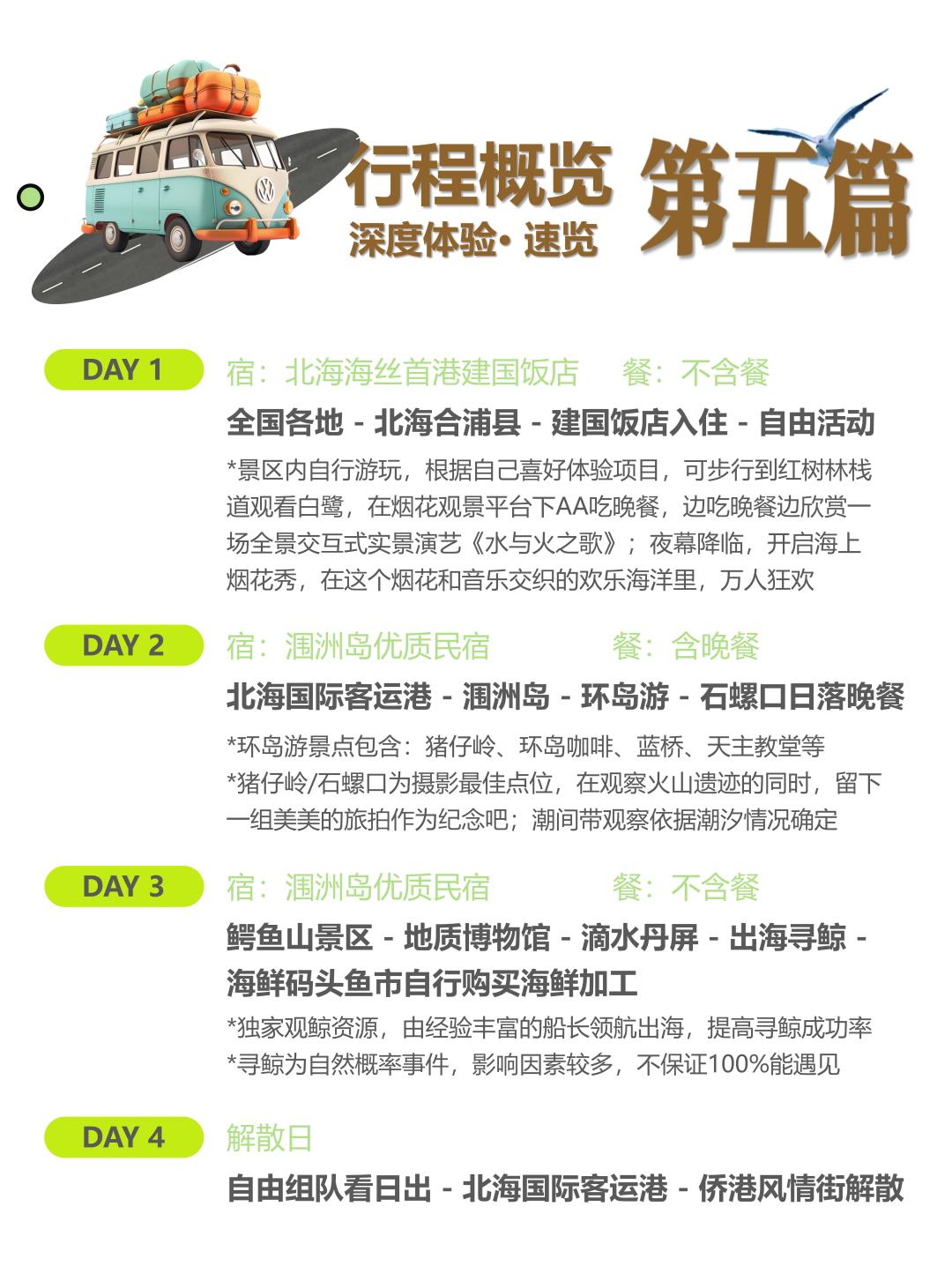 1、涠洲岛经常受大风影响导致停航,出发前2天如接到通知不能上岛,报名团费全部退回,不作赔偿,敬请理解!