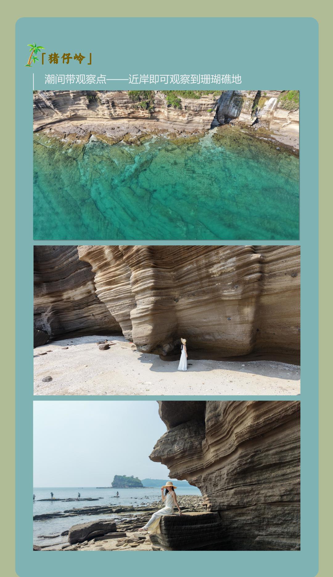 15:30 乘坐观光车进行环岛游,去人迹罕及的猪仔岭拍摄大片,潮位合适的时候我们在岸边观察活体珊瑚、潮间带生物,途径环岛咖啡、蓝桥、天主教堂等风景优美的区域,边喝咖啡边欣赏优美的景色;