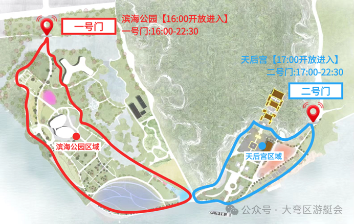 滨海公园(一号门)与天后宫(二号门)周边设置有多个停车场。自驾前往的游客可按进场需求导航至对应停车场,停车后步行进入灯会参观游览。